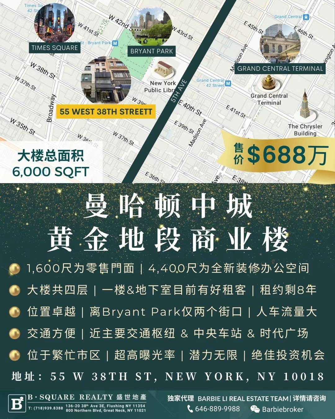 1,600尺为零售門面14,40.0尺为全新装修办公空间大楼共四层|一楼&地下室目前有好租客|租约剩8年位置卓越|离Bryant Park仅两个街口人车流量大交通方便|近主要交通枢纽& 中央车站 & 时代广场位于繁忙市区|超高曝光率|潜力无限|绝佳投资机会地址:55 W38THST,NEW YORK,NY10018