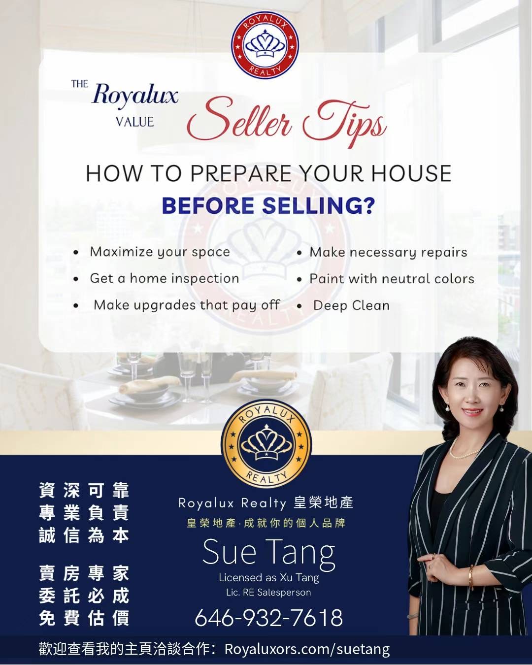 法拉盛华人房地产公司 纽约高端经验房地产经纪 The Best Real Estate Agent in New York 纽约地产经纪最佳地产经纪人您未来几个月是否有卖房的打算呢?这里与您分享6件您在卖房前可以先做的准备事项,让您在准备好卖房的时候能够更顺利进行!您是否想找一个资深又能帮您卖高价的经纪呢?欢迎联系我了解我的33项主动推广营销策略能怎么帮您卖高价吧!