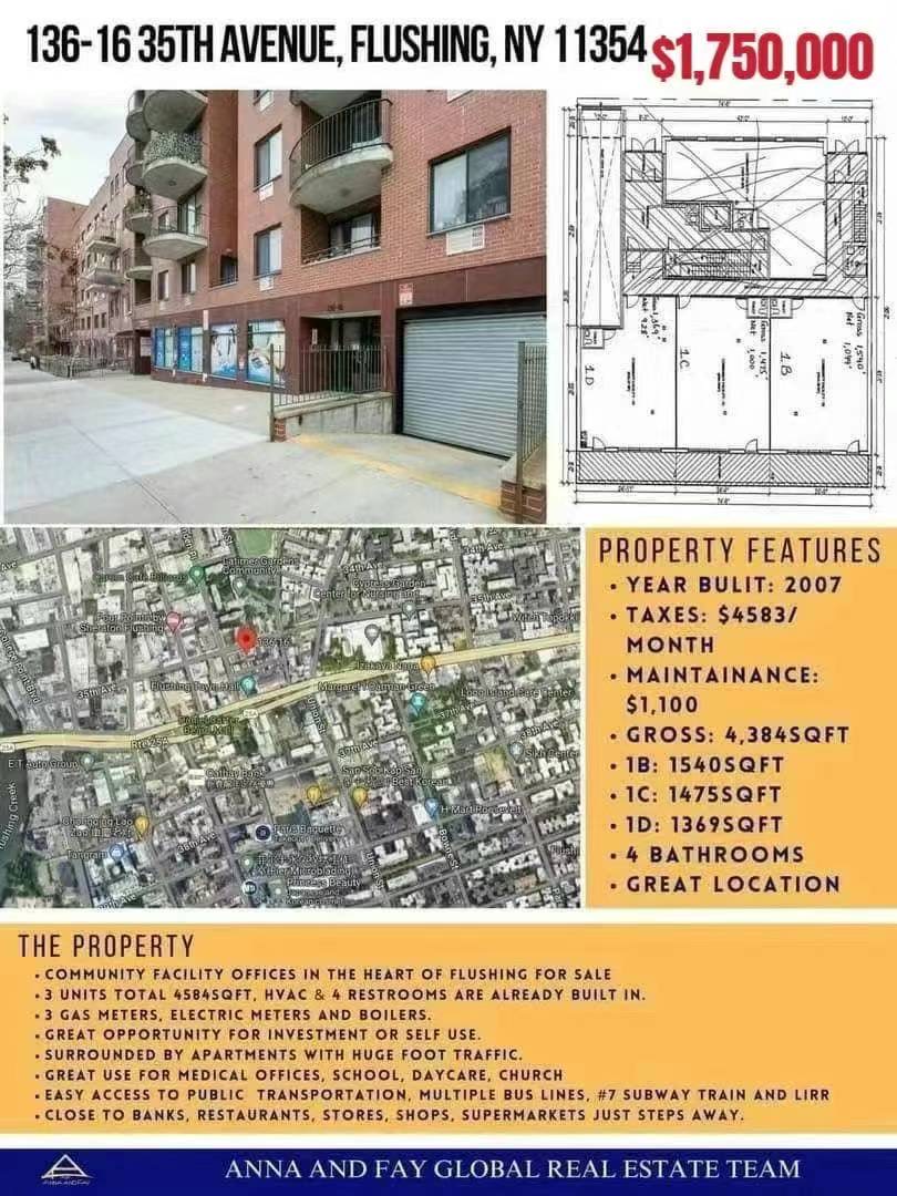 ☀️☀️🏅🏅新上市 位于法拉盛中心 社区服务出售136-16 35ave Flushing 11354. Community facility offices in the heart of Flushing for sale/lease.  $1.75MM /15,000 Month