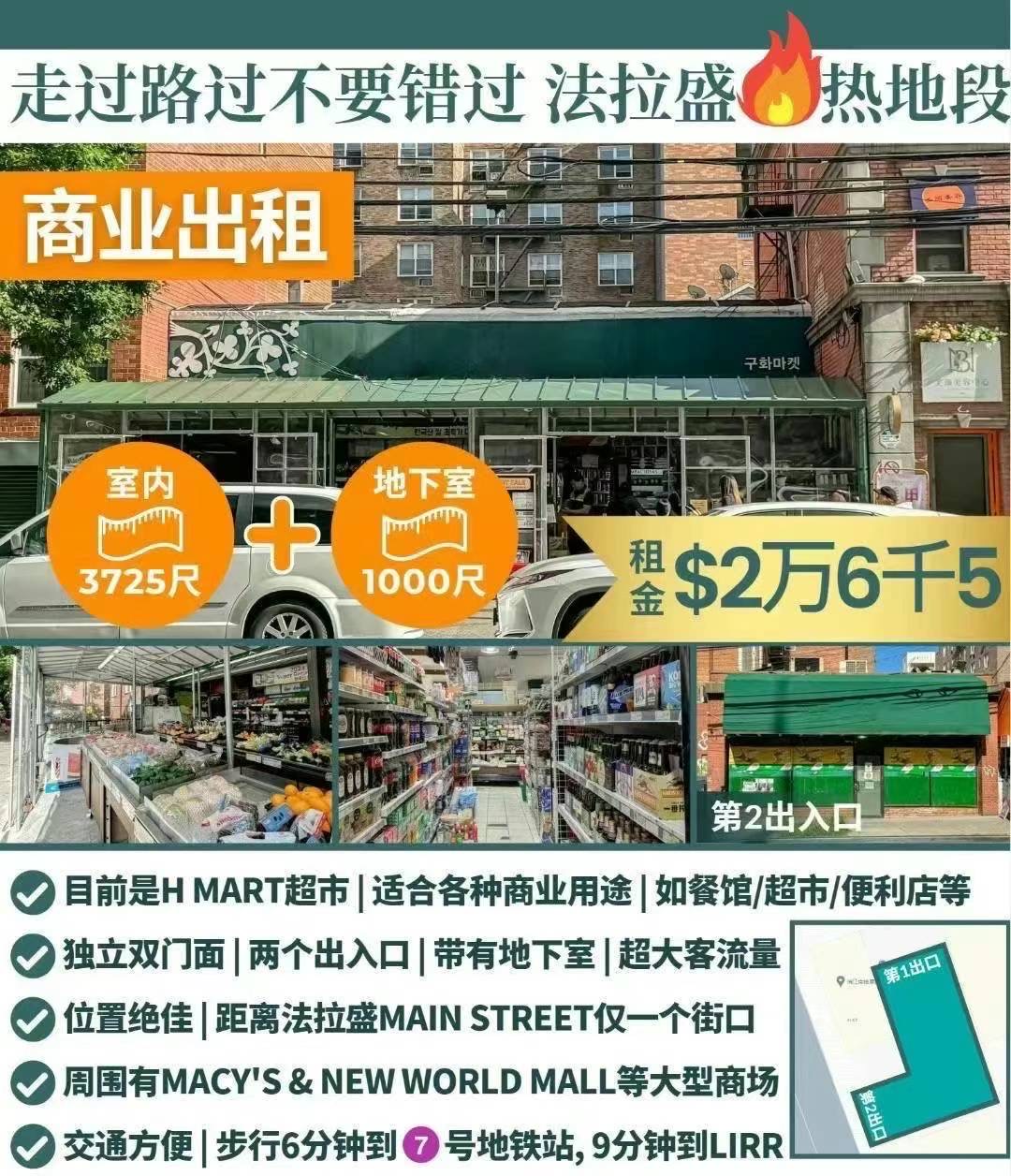 纽约商业地产出租 新上市法拉盛独立商业双门面!目前是H Mart!无转让费!4000 尺 2万6千5,可改回停车位在门口