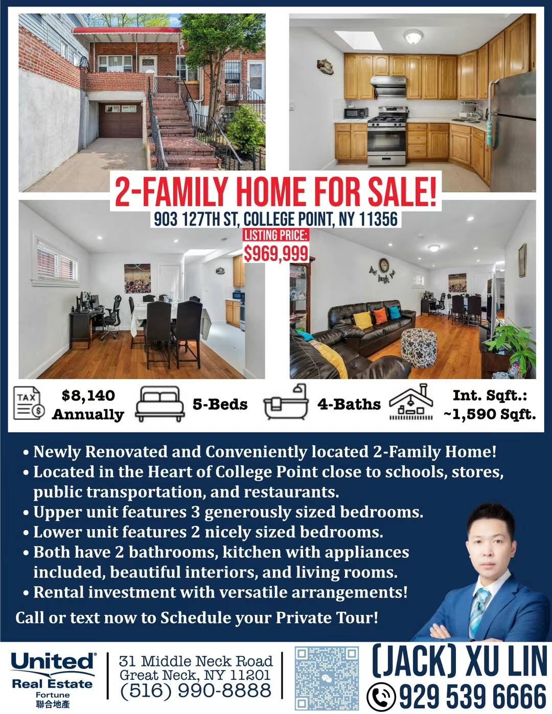 College Point纽约大学点房子出售 College Point NY House For Sale新上市大学点房屋出售 🔥🔥🔥独家代理 欢迎转发。 拎包入住,无需装修 可投资 可自住,大饱口福附近2家庭出售!近学校🏫 bus 🚌 903 127TH ST, COLLEGE POINT, NY 11356挂牌价:$969,999税$每年$8,1405 间卧室4 间浴室...........~1,590 平方英尺。内部面积:新装修且位置便利的 2 户住宅!位于 College Point 中心地带,靠近学校、商店、公共交通和餐厅。上层单元设有 3 间宽敞的卧室。2卫。 下层单元设有 2 间大小适中的卧室。两间卧室均设有 2 间浴室、带家电的厨房、美丽的内饰和客厅。欢迎索取更详细照片。预约观看内部.看房热线:929-539-6666