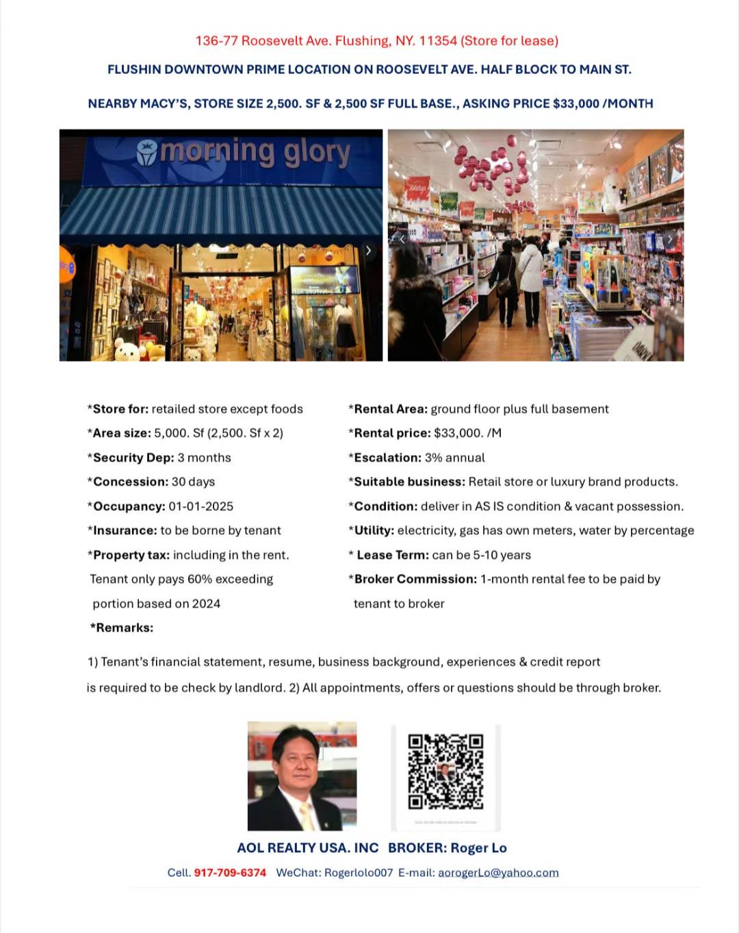 🌹发盛鄰梅西百货商场,罗斯福路上.共5000呎(店2500呎+全地室2500呎) 出租无需顶手费,月租$3.3 万 欲速洽:合家欢地产公司 917-709-6374 罗傑