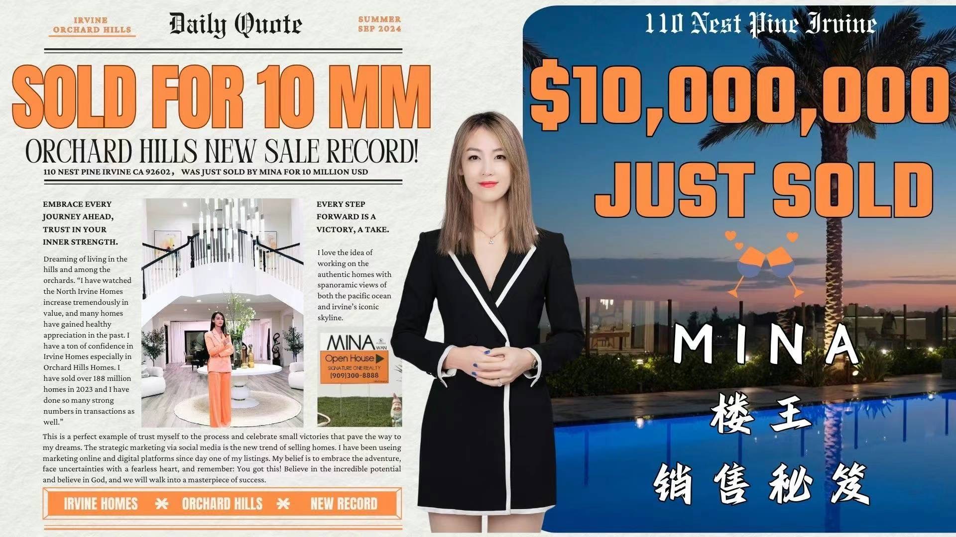 Mina Wan The Best Real Estate Broker in Los Angeles Mina Wan洛杉矶地产经纪最佳地产经纪人 法拉盛华人房地产公司 纽约高端经验房地产经纪 尔湾市场回温中!最近主导SPONSOR的房产影视真人秀也在有条有序的进展中。公司的10月底销售已破3.33亿,所以说今年是咱们新媒体经纪人证明自己的好时机。我们所在的房产和金融行业更是需要不断创新。线上销售,云端看,油管,短视频,直播,房产影视,创始人IP和线上互动,都已然是我们现在流行的人与客户之间的交流方式。从企业家到网红,从创业者到精英人士,都离不开学习这门新媒体的流量语言,来讲述你的故事,建立信任和品牌形象,赢得人心。而我们所谓的学习和创新,就是去过去一切经验的总和,加上一个接受新事物和勇于师承的心。过去几年,我们所合作过的千个家庭和屋主,交流合作过的数百名经纪人,看到了许多行业的趋势变化。其实每一项所取得的成功,所遭遇到的挫折,所经历的迷失都是未来的宝贵财富。新时代,大家其实不应该被落下,应该学习和适应市场。一个人进步最快的时候,其实就是失去安全感的时候。必须客服恐惧、依赖和失望,长出自己的盔甲,深耕自己的羽翼和知识,才是王道。期待大家继续合作,一起交流新媒体和房产,年底再冲刺目标。
