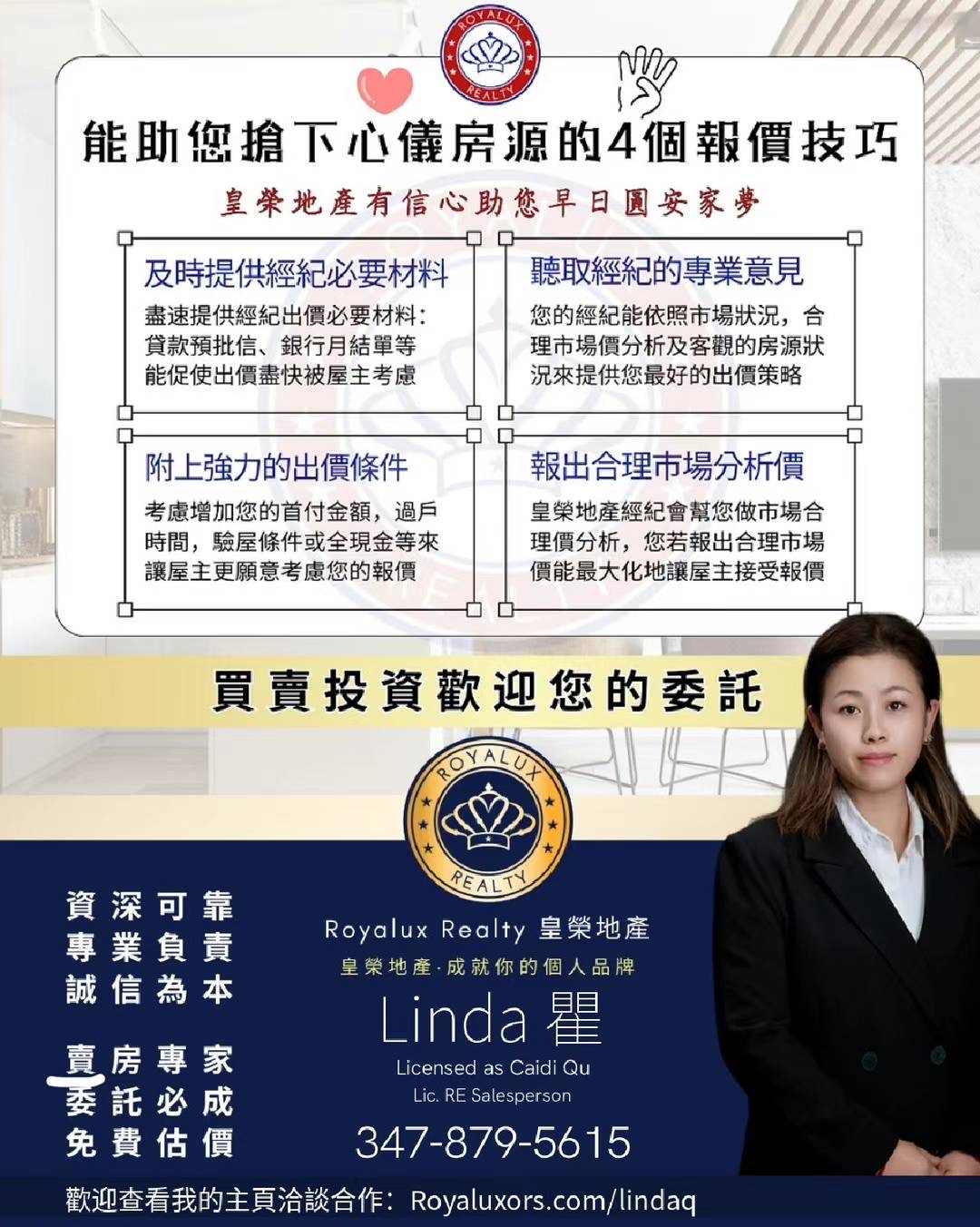 法拉盛华人房地产公司 纽约高端经验房地产经纪 The Best Real Estate Agent in New York 纽约地产经纪最佳地产经纪人您是否对一直抢不下房子很气馁呢?找我就对了!我有个4步抢手房源出价策略,专门帮客户抢下他们心仪的房源,欢迎联系我了解更多细节您的专属地产顾问师,助您达成所有房地产需求谢谢您的信任,房地产买卖投资都欢迎您的委托欢迎查看我的个人主页洽谈合作: Royaluxors.com/lindaq