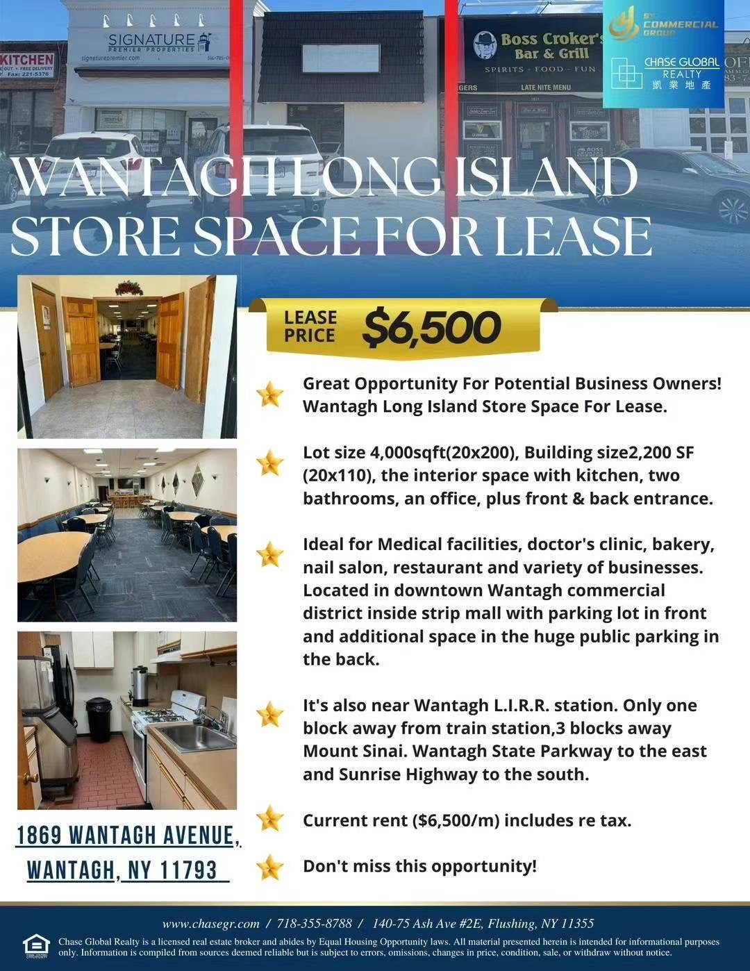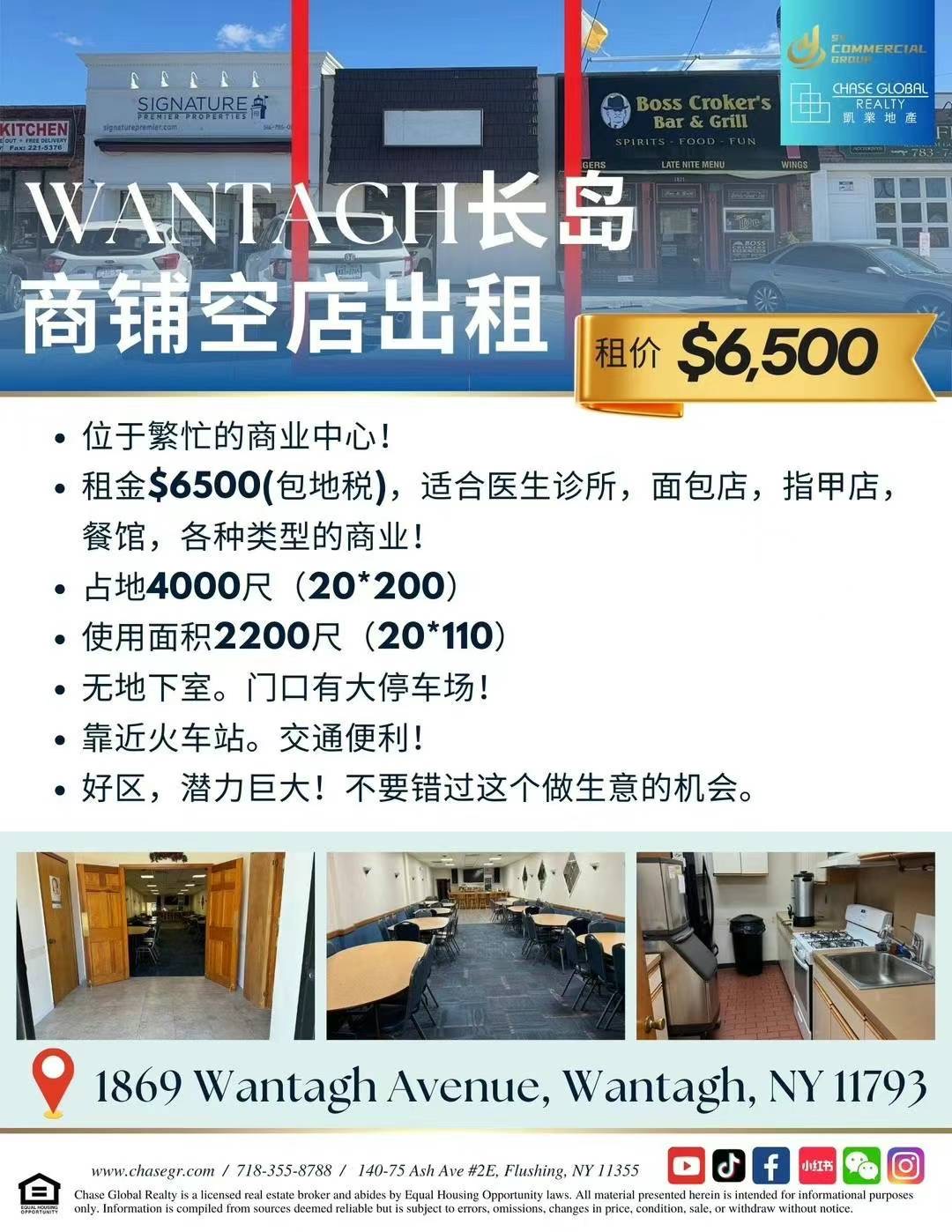 长岛商铺 空店出租,位于繁忙的商业中心!租金$6500 (包地税),适合医生诊所,面包店,指甲店,餐馆,各种类型的商业! 欢迎所有人。占地4000尺(20*200),使用面积2200尺(20*110),无地下室。门口有大停车场!靠近火车站。交通便利!好区,潜力巨大!不要错过这个做生意的机会。地址: 1869 Wantagh Ave,Wantagh, NY 11793