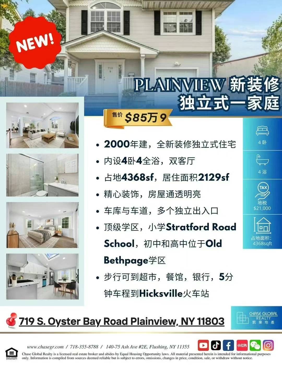 Long Island Plainview纽约长岛普莱恩维尤房子出售Plainview NY长岛普莱恩维尤房屋出售🔥凯业地产全新房源Plainview 新装修独立式一家庭出售🔥📍719 S. Oyster Bay Road Plainview, NY 11803🔹2000年建,全新装修独立式住宅🔹内设4卧4全浴,双客厅🔹占地4368sf,居住面积2129sf🔸精心装饰,房屋通透明亮🔹车库与车道,多个独立出入口🔸顶级学区,小学Stratford Road School,初中和高中位于Old Bethpage学区🔹步行可到超市,餐馆,银行,5分钟车程到Hicksville火车站看房请预约[玫瑰]☎凯业地产Denise li 347-350-0059