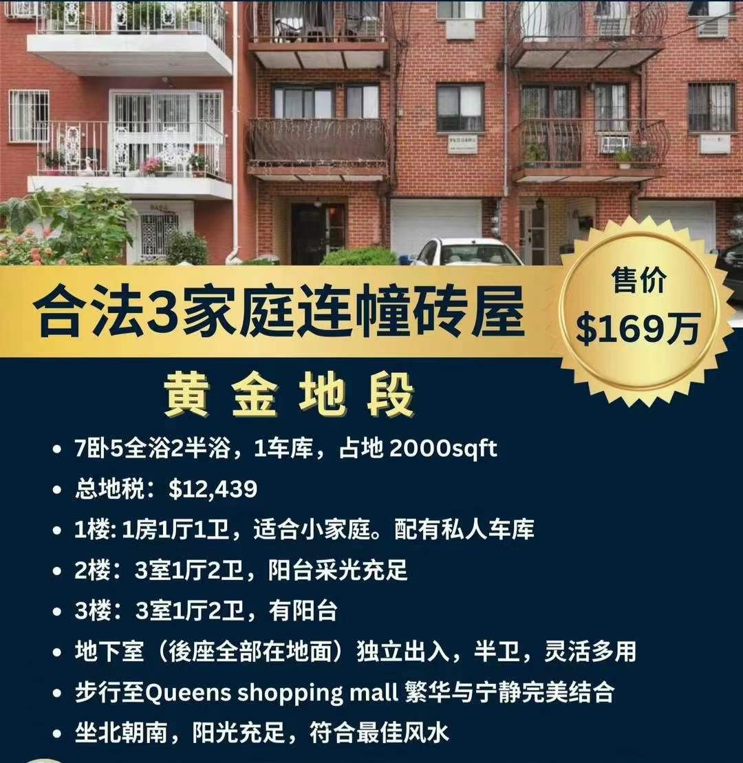 Queens NY纽约皇后区房子出售买卖Queens NY Residential House For Sales新上市经纪独家代理 黄金地段合法三家庭连幢砖屋出售 🔥