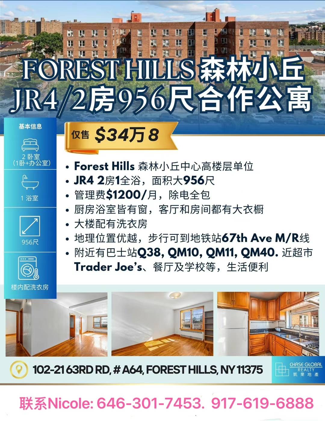 Forest Hills纽约森林小丘房子出售Forest Hills NY House For Sale新上市森林小丘房屋出售森林小丘面积大两房Coop,仅34 万8,退休了住在这里最亨受了!FORESTHILLS森林小丘 JR4/2房956尺合作公寓基本信息 仅售 $34万8 2卧室(1卧+办公室) Forest Hills 森林小丘中心高楼层单位 JR4 2房1全浴,面积大956尺1浴室 管理费$1200/月,除电全包 厨房浴室皆有窗,客厅和房间都有大衣橱大楼配有洗衣房956尺 地理位置优越,步行可到地铁站67th Ave M/R线 附近有巴士站Q38,QM10,QM11,QM40.近超市 Trader Joe’s、餐厅及学校等,生活便利楼内配洗衣房102-2163RD RD,#A64, FORESTHILLS, NY 11375 REALTY CHASE GLOBAL凯棠地產 联系Nicole: 646-301-7453.917-619-6888