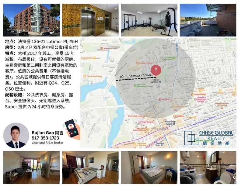 Flushing纽约法拉盛豪华公寓出售 Flushing Luxury Coop For Sale新上市法拉盛高级合作公寓买卖 方便约看!法拉盛中心2房2卫1天台1阳台 $674.85/m 低管理费全包除电$75万(含室内车位1个 )2017年新建Condo 享有15年地税减免,还剩7年减税。2房2卫2阳台,户型方正还带一个车位,进门是敞开式客厅和就餐厨房,客厅左右各有1个卧室,做到晚上睡觉互不打扰的优点。大楼拥有密码锁,内外配备监控摄像头,并且大楼卫生每天清洁,环境优雅舒适,娱乐设施包括:洗衣房,健身房 & 观景天台。门口就有公园,转角可坐Q25,Q34,Q50 bus,步行10分钟即可到达法拉盛中心地铁站。136-21 Latimer Pl,#5H, Flushing,NY欢迎合作,RG 917-353-1723