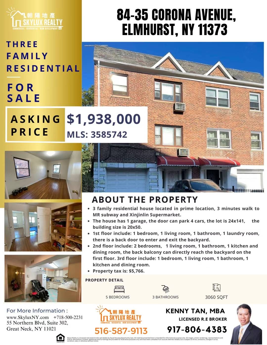 獨立代理Elmhurst中心,黃金地段 ,走3分鐘MR地铁,新金麟超市,华人最喜欢的大型553单边砖房,3层带1车库,门囗可停4部车地24x141 房子面积20x50 ,1 楼1房一厅一卫一洗衣房有后门可以进出后院,2 楼2房1大厅1卫1厨房吃饭厅後面阳台可直达一楼后院,3楼1房1大厅一卫一廚房吃飯厅,全部可清空售$192万。