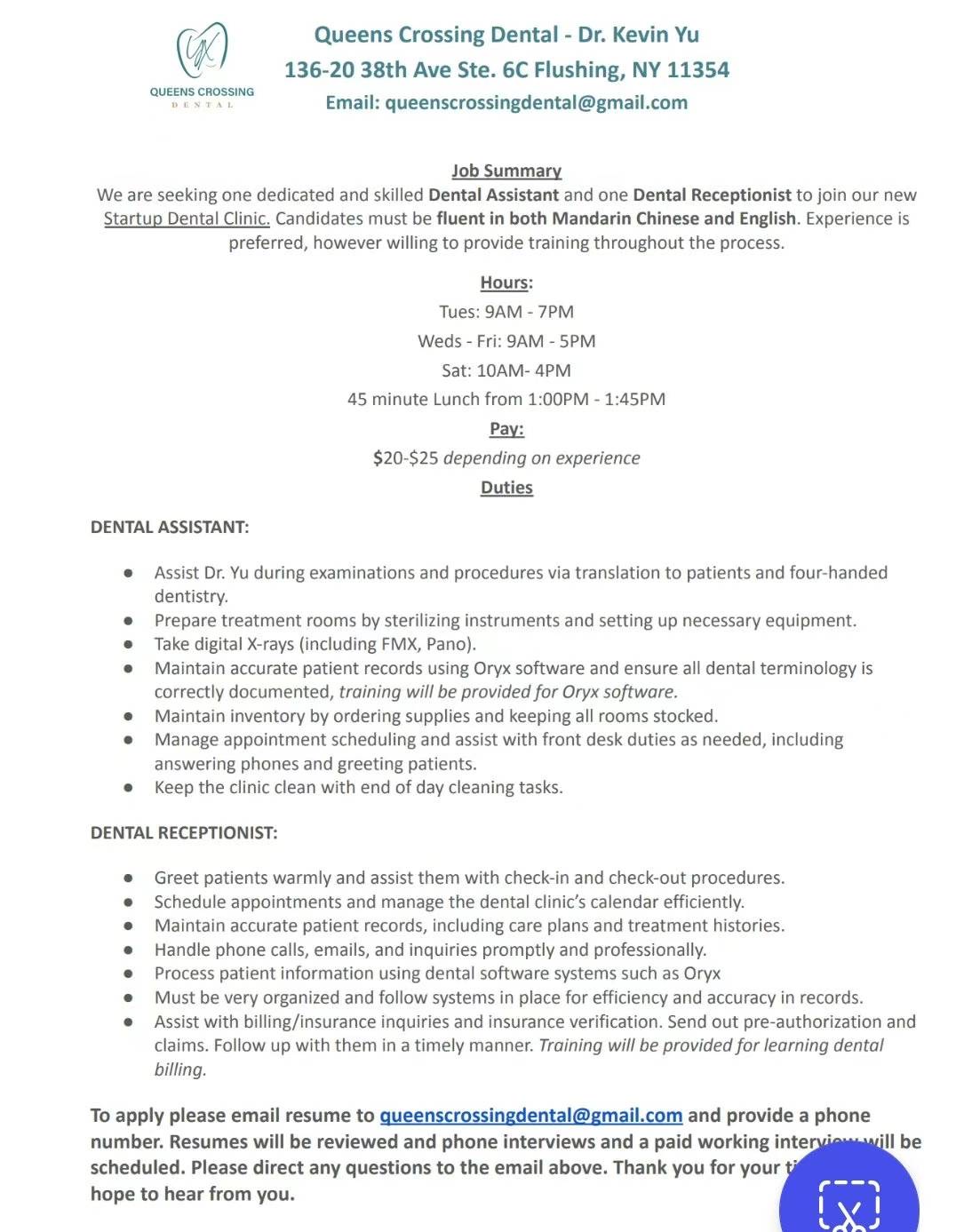 帮朋友转发 - 法拉盛中心新开牙医诊所招牙医助理和前台。请直接联系邮箱email