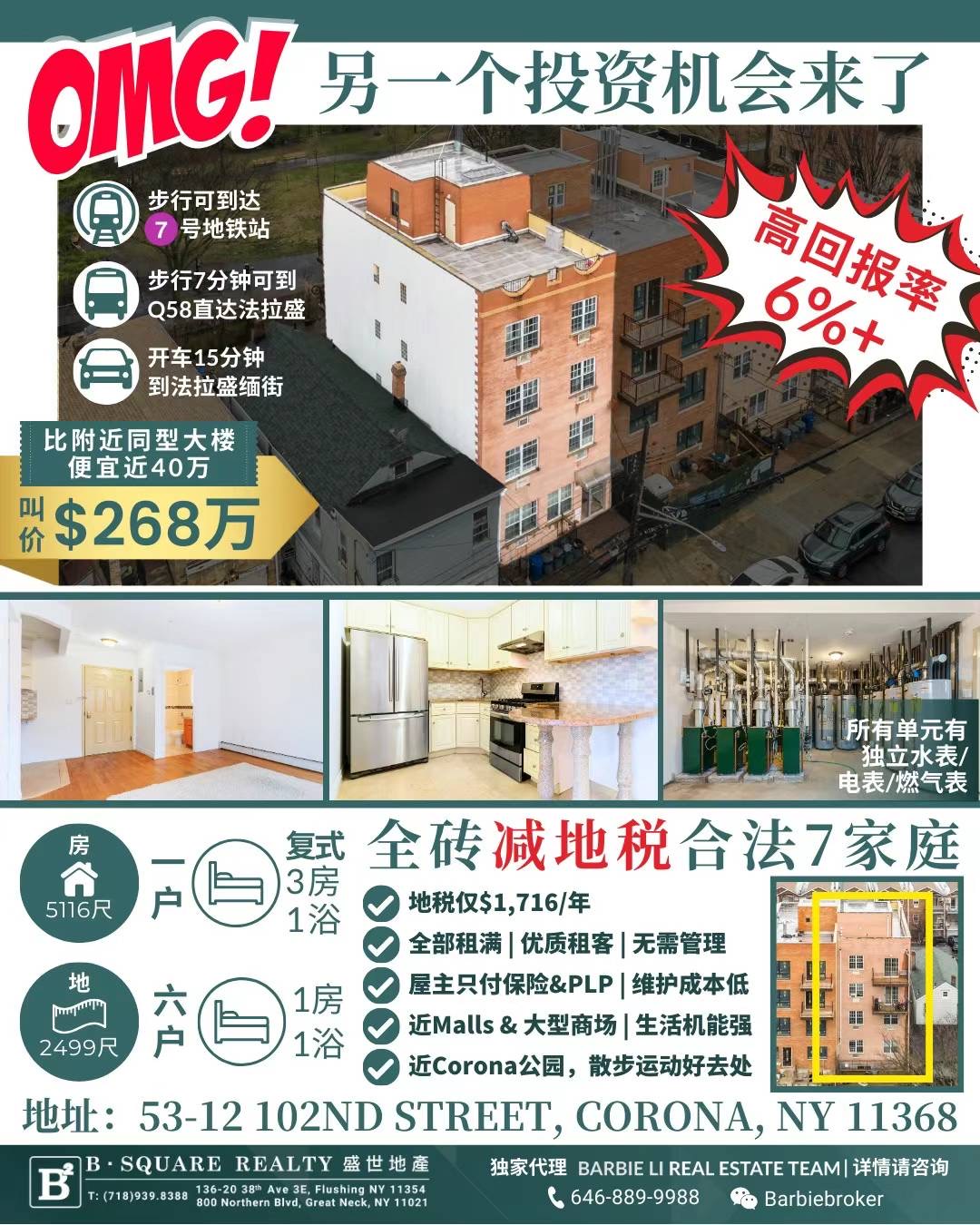 Corona纽约可乐娜房子出售Corona NY House For Sale新上市可乐娜房屋出售💎 投资者看过来!年轻减地税合法7家庭💎