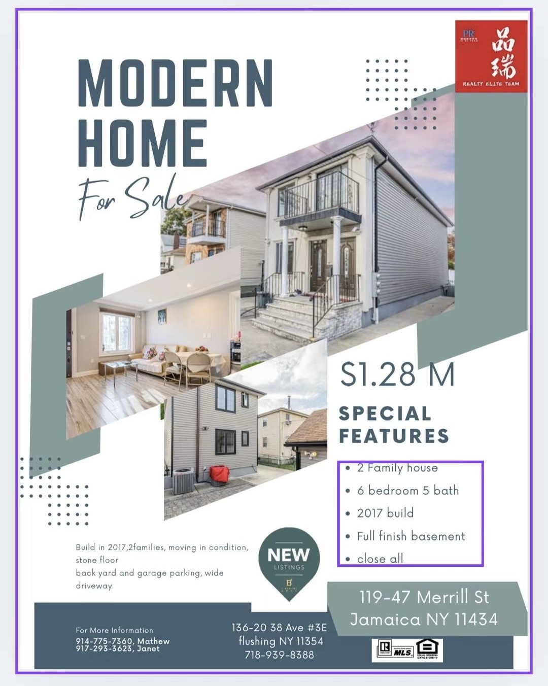 Jamaica 纽约牙买加房屋出售 Jamaica NY House For Sale新上市牙买加房屋出售**隆重推出!** 独栋两家庭住宅**:2017 年全新打造,每层三间卧室和两间浴室,二楼带大阳台,阳光通透,完美适合大家庭或投资者。坐东北朝西南,四平八稳,方正- **地下室宽敞高屋顶7.5“,分门出入**:适合多用途使用,可作为娱乐区或额外存储空间。3个电表,2 个煤表,