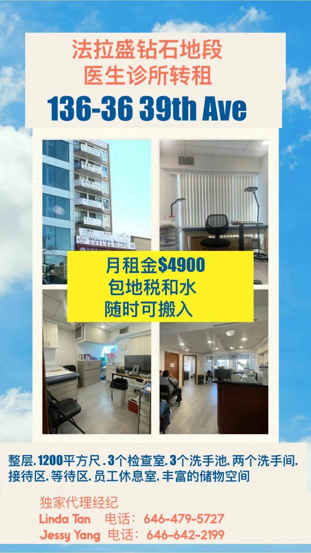 法拉盛中心医生办公室转租! 可做医美等用途。 面积1200平方英尺, 租金仅仅$4900 包地税和水!详情请☎️646-642-2199