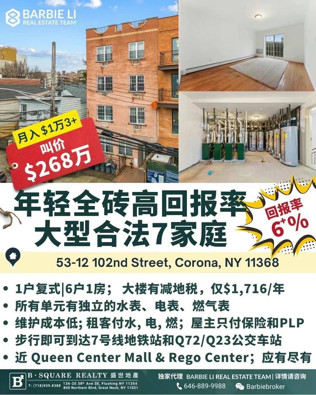 REAL ESTATE TEAM月入$1万3+叫价$268万年轻全砖高回报率回报率6%大型合法7家庭53-12 102nd Street, Corona, NY 113681户复式|6户1房;大楼有减地税,仅$1,716/年所有单元有独立的水表、电表、燃气表维护成本低;租客付水,电,燃;屋主只付保险和PLP步行即可到达7号线地铁站和Q72/Q23公交车站近 Queen Center Mall & Rego Center;应有尽有