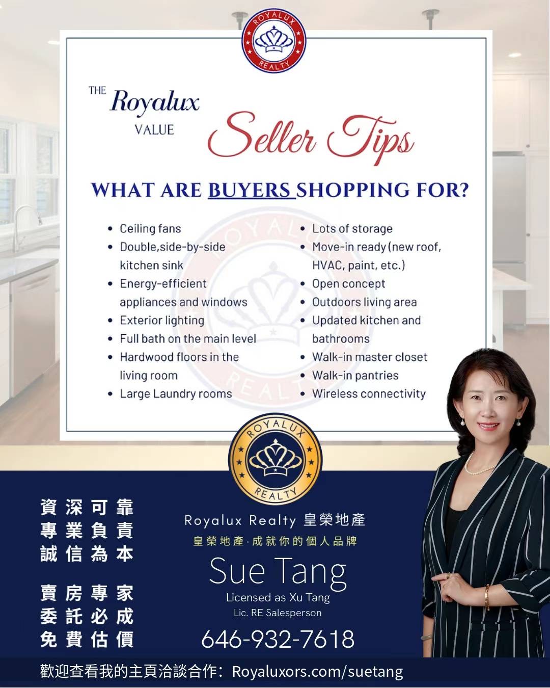 法拉盛华人房地产公司 纽约高端经验房地产经纪 The Best Real Estate Agent in New York 纽约地产经纪最佳地产经纪人您是否想最大化的将您的房子以最高价卖出呢?这里与您分享一些最能吸引买家出价的房屋特点,供您参考~您是否想找一个资深又能帮您卖高价的经纪呢?欢迎联系我了解我的33项主动推广营销策略能怎么帮您卖高价吧!您的专属地产顾问师,助您达成所有房地产需求谢谢您的信任,房地产买卖投资都欢迎您的委托欢迎查看我的个人主页洽谈合作: Royaluxors.com/suetang