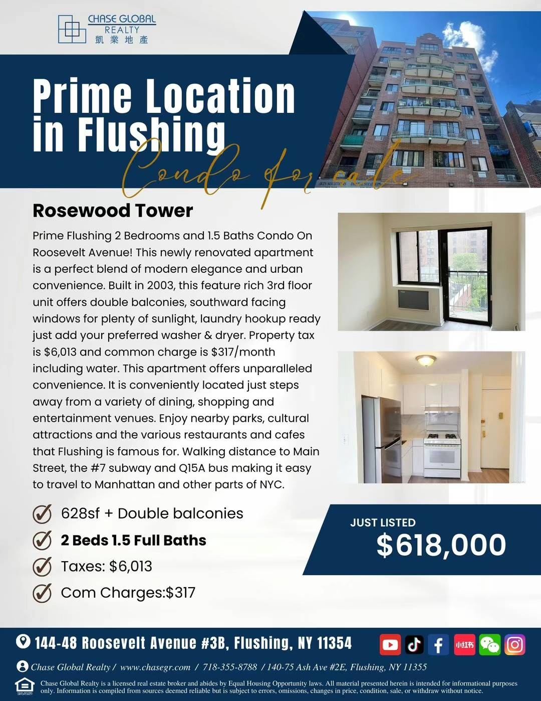 Flushing纽约法拉盛豪华康斗出售Flushing NY Luxury Condo For Sale新上市法拉盛高档康斗预售 本周日 1:30-3:30pm可看,独家代理2房1.5浴仅售61万8,法拉盛康斗步行mianst缅街,新装修,3楼仅售61万8。双阳台,全部窗户朝南,阳光充足2003年新建, 地税$6013,管理费$317/月包水。可自行安装洗衣机烘干机。这套新装修的公寓完美融合了现代优雅与城市便利。地理位置优越,距离各种餐饮、购物和娱乐场所仅几步之遥。这套公寓提供无与伦比的便利。步行即可到达7#地铁,巴士Q15A,轻松前往曼哈顿和纽约市其他地区。享受附近的公园、文化景点以及法拉盛著名的各种餐厅和咖啡馆。地址:14448 Roosevelt Ave APT 3B, Flushing, NY 11354欢迎合作Sophia Yao: 929-260-9118