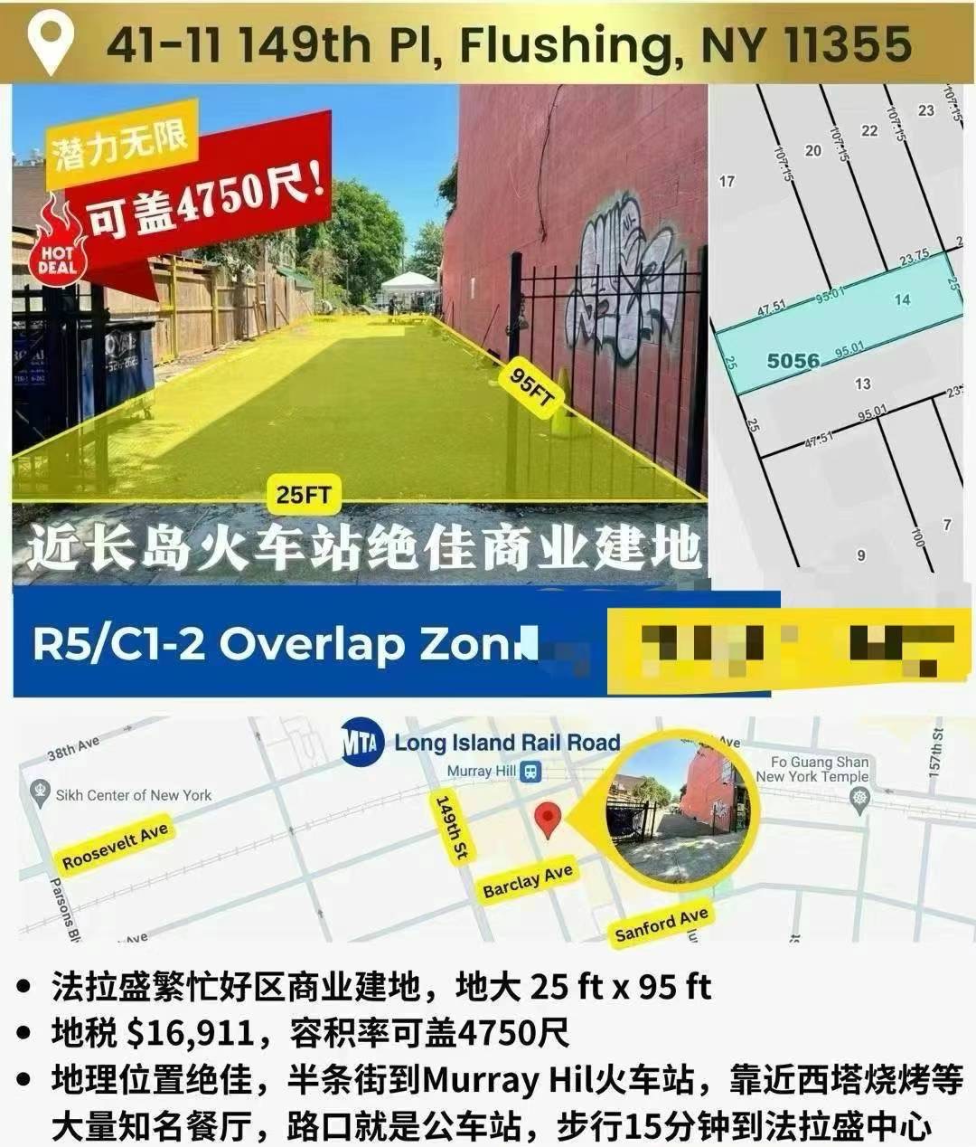 🔥💥新上市💙凯盛地产💙独家代理‼️🌟【法拉盛Murray Hill 火车站附近,绝佳商业建地】🌟🟡法拉盛繁忙好区商业建地🟠地大 25 ft x 95 ft🔵R5, C1-2 overlap Zoning🔴地税 $16,911,容积率可盖4750尺🟡地理位置绝佳,半条街到Murray Hill火车站,靠近西塔烧烤等大量知名餐厅,路口就是公车站,步行15分钟到法拉盛中心3478858668