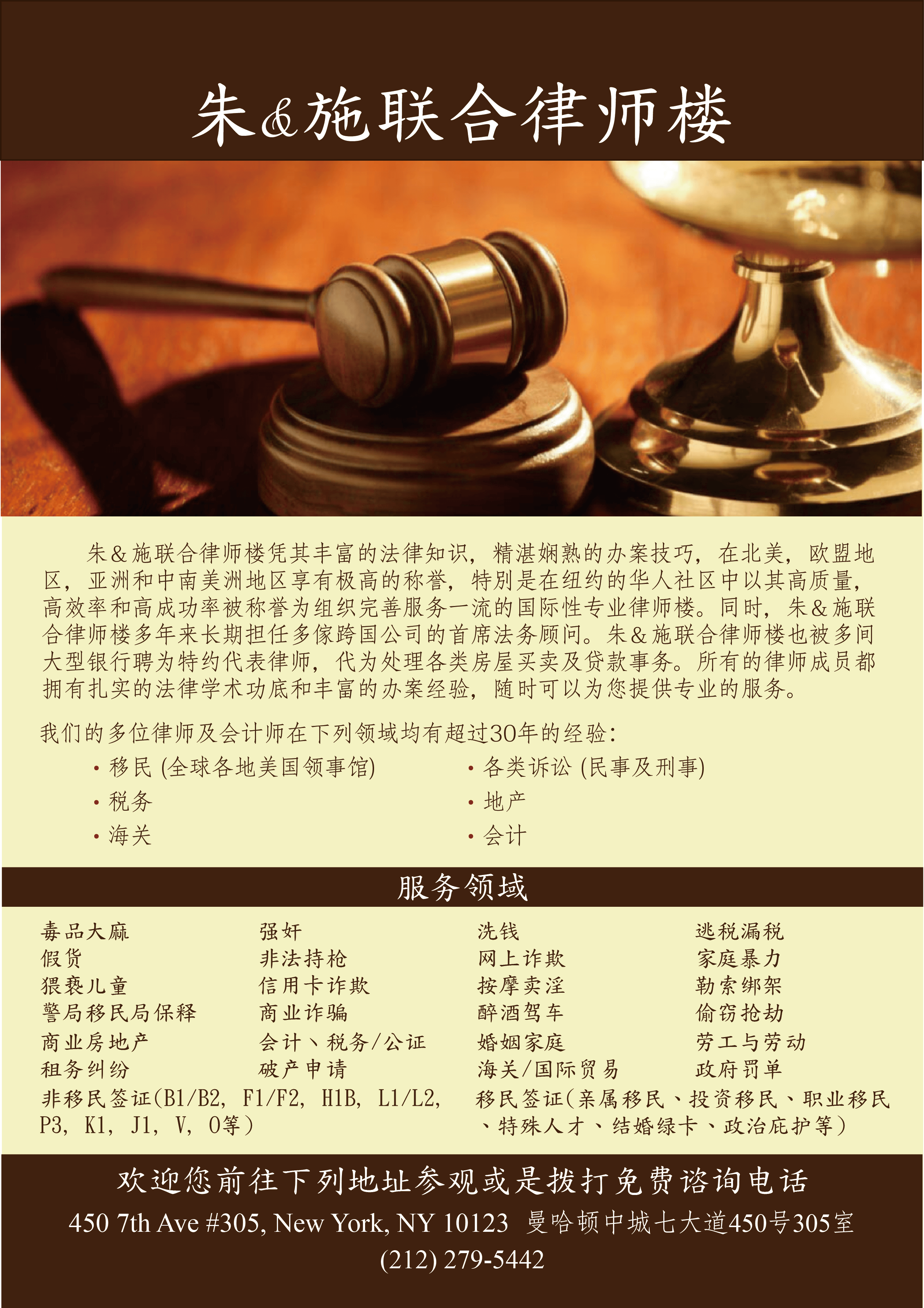 朱&施联合律师楼凭其丰富的法律知识,精湛娴熟的办案技巧,在北美,欧盟地区,亚洲和中南美洲地区享有极高的称誉,特別是在纽约的华人社区中以其高质量,高效率和高成功率被称誉为组织完善服务一流的国际性专业律师楼。同时,朱&施联合律师楼多年来长期担任多傢跨国公司的首席法务顾问。朱&施联合律师楼也被多间大型银行聘为特约代表律师,代为处理各类房屋买卖及贷款事务。所有的律师成员都拥有扎实的法律学术功底和丰富的办案经验,随时可以为您提供专业的服务。