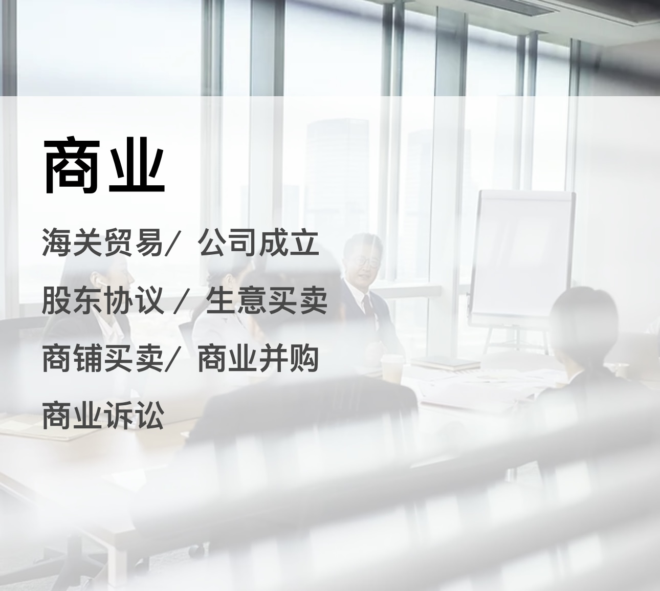参与各大公司融资、并购,重组项目。并且擅长于解决国际公司争端仲裁协商谈判,我们致力于为商业客户节省资本及利润最大化,当客户获得巨大效益时,我们也获得宝贵的经验和丰硕的成果。专业的律师团队负责商务诉讼、股权设计、商务契约、公司设立、合并收购、 跨境收购、合同起草、经济纠纷、生意买卖、贷款申请、资产调查、跨境电商、商标注册、商务减税、银行拍卖、私募基金。