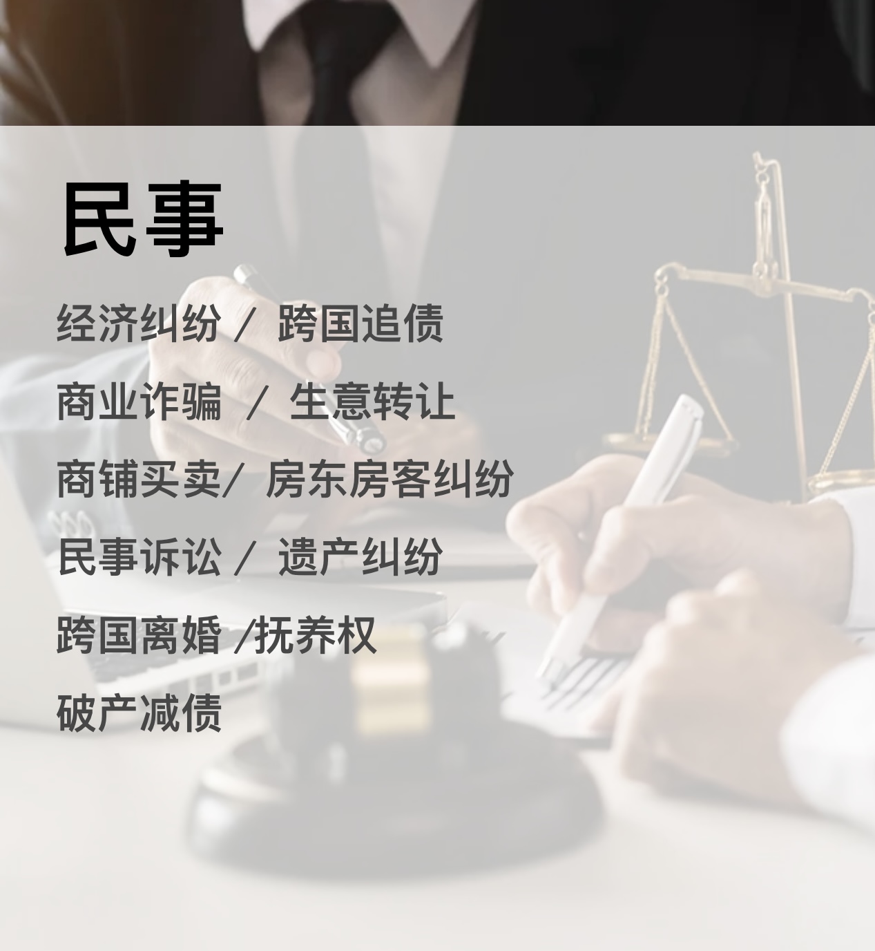 我们有多年的民事案件经验,以及对各个不同法庭的程序非常之熟悉,这么多年的经验致使我们的业务范围很广泛。我们承接的民事案件。包括股权、合同、稅务、债务、专利、海运、劳工、建筑、离婚、遗产、破产、诽谤等。我们的律师除以上基本领域之外尤其擅长车祸赔偿,帮众多受害者和弱势群体,争取到巨额的赔偿,获得客户赞誉。同时也擅长各类离婚诉讼,争议或无争议,单方离婚,跨国离婚,子女抚养权,财产纠纷,遗产、遗嘱信托等等,处理各部门罚单,劳工局罚单等等。