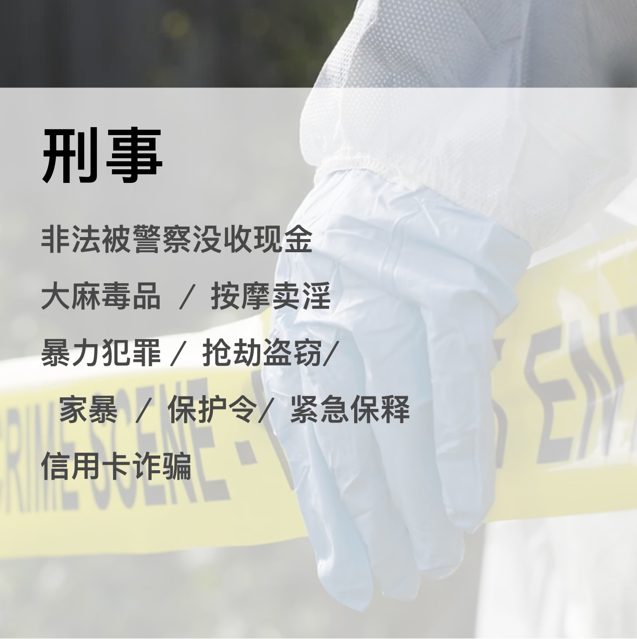 洗钱偷税、性侵强奸、非法持枪、毒品大麻、大麻执照、家庭暴力、按摩卖淫、交通肇事、青少年犯罪等