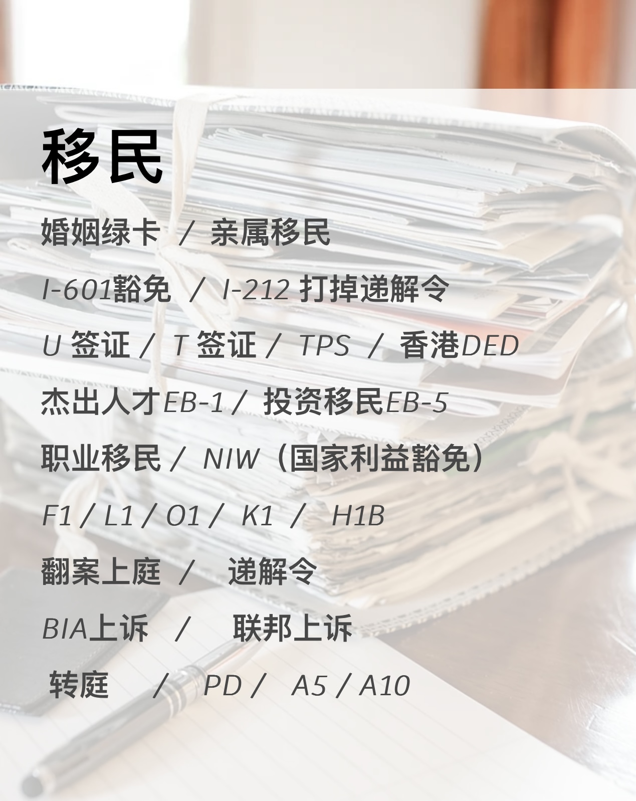 亲属移民、婚姻绿卡、递解令、U签证、T签证、翻案上诉、I-601豁免、家暴绿卡