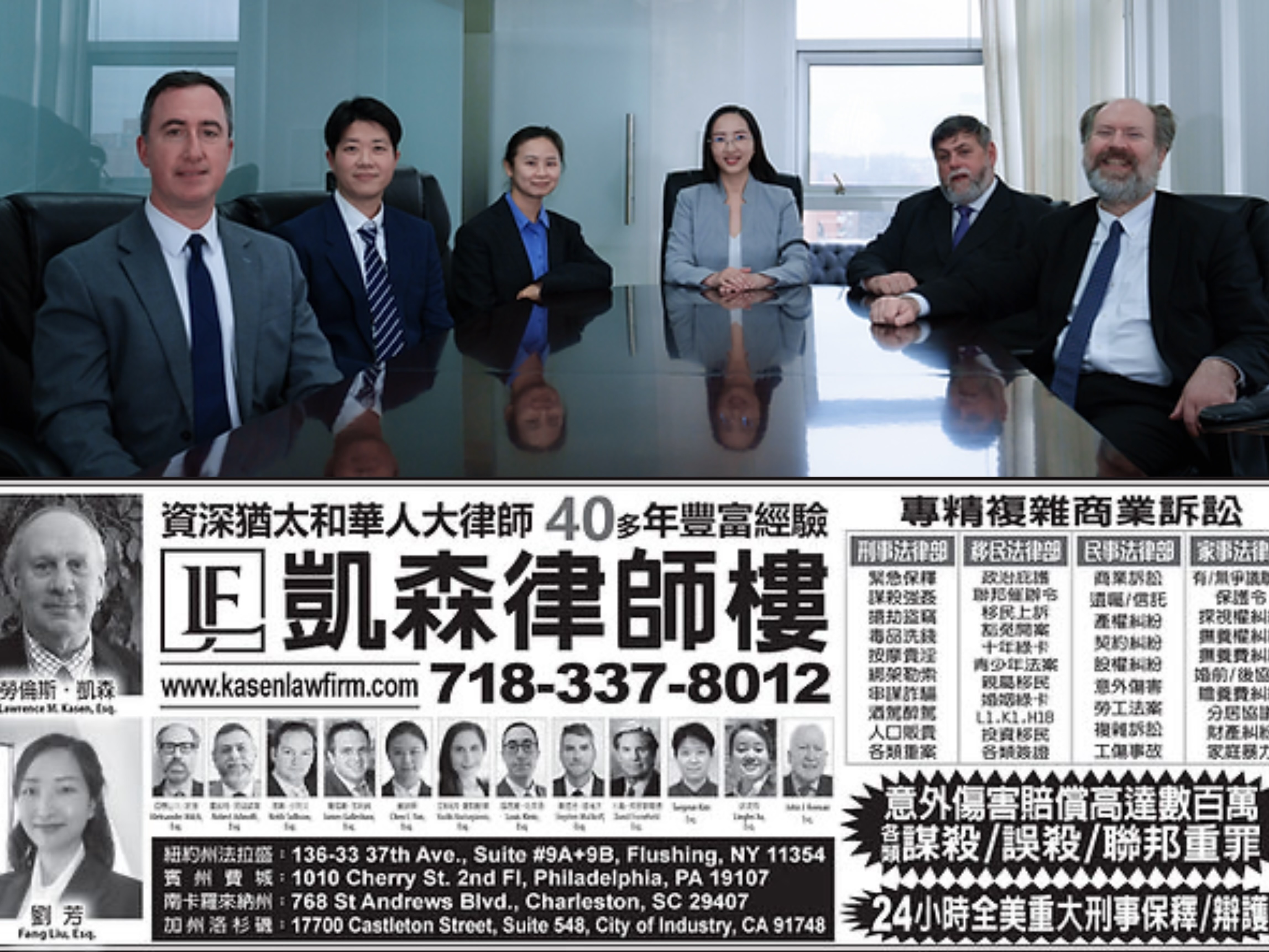 凯森律师楼帮助您追求您的利益 纽约凯森律师楼四十多年前,我们的创始成员 Lawrence M. Kasen 开始从事法律工作,帮助美国原住民和部落在日益复杂的印第安人法和自然资源法领域中打拼,打击试图侵犯部落和美国原住民个人权利的州和地方政府以及私营企业。随后,他开始为精品律师事务所工作,阻止大公司侵犯个人权利。近三十年前,Kasen 先生在佛罗里达州迈阿密成立了自己的律师事务所,最终迁至南卡罗来纳州查尔斯顿,现在在纽约法拉盛设有第二家办事处,以捍卫和保护其多元化的美国和国际客户的权利和利益。在他的法律合伙人 Fang “Jessie Kate” Liu 和五名助理律师以及大量支持人员的帮助下,Kasen Law Firm, PLLC 自豪地提供移民法、刑法、民事诉讼、房地产法和房东-租户法实践领域的法律服务。我们在这里帮助您,我们的客户,追求您的利益。法律执业领域 在凯森律师楼,我们专业的律师团队致力于了解您独特的法律需求。我们专注于各种实践领域,包括刑事辩护、民事诉讼、人身伤害法、公司法和移民法。