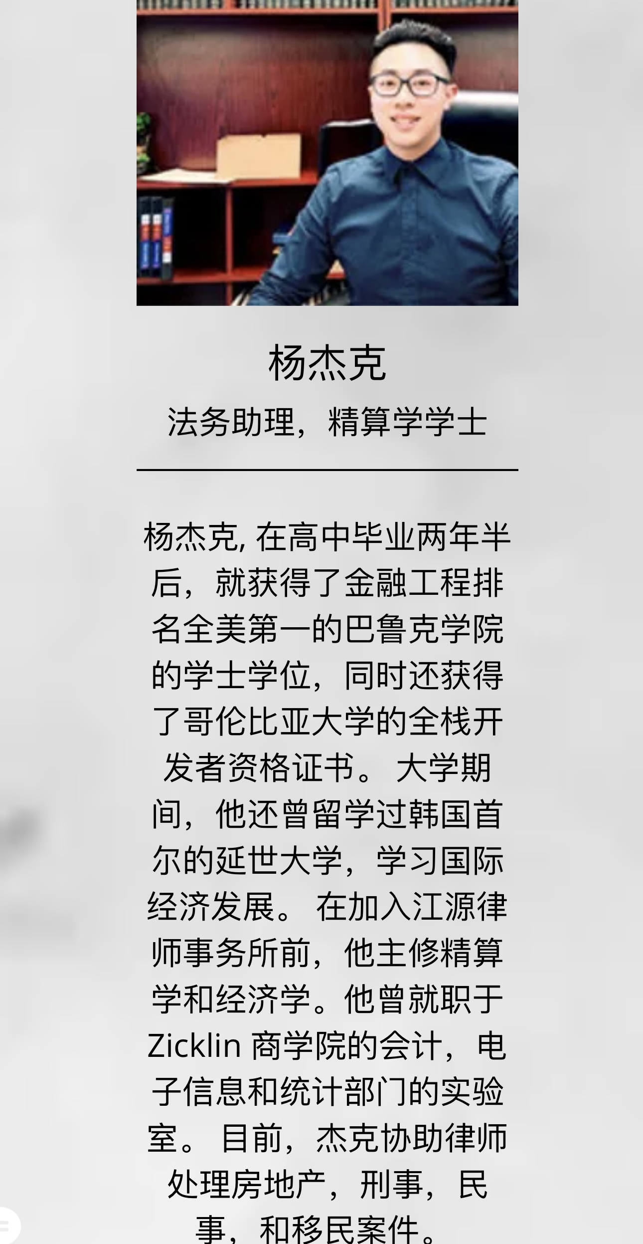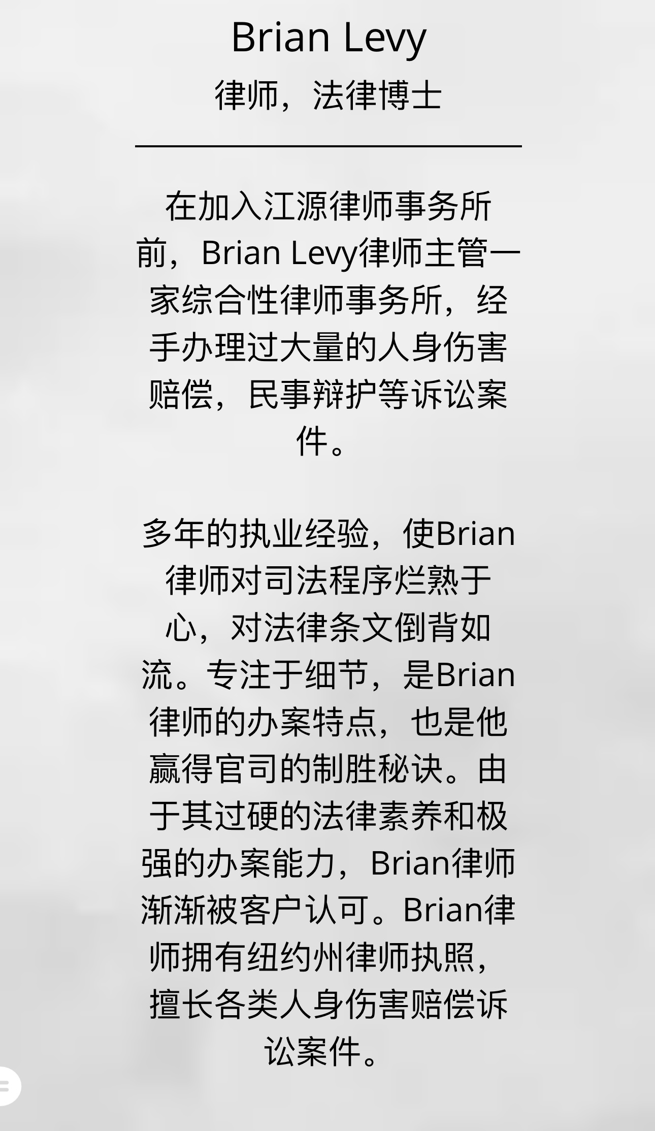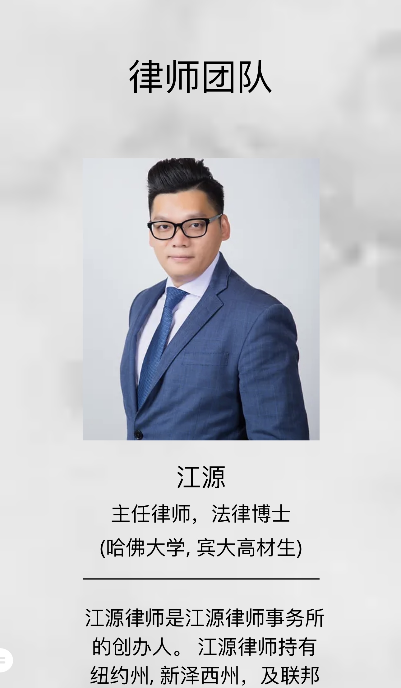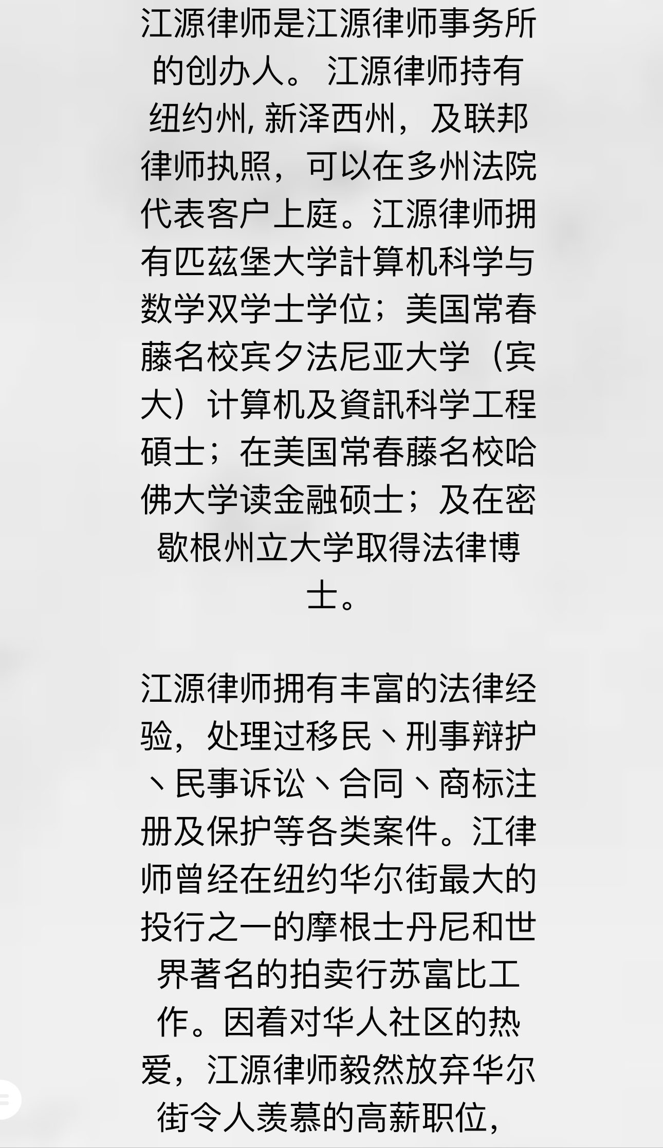 江律师曾经在华尔街著名投行摩根士丹尼任职软件工程师,为其全球财富管理设计和实施了一个价值非凡,大规模的新开户商业系统,增强了网络业务,为投行的创收方面有很大的表现;以及在著名的苏富比拍卖行任职软件工程师。凭借在著名投行任职的便利,使他对股票产生了兴趣丶及有效的投资,创建了他个人的财富。之后他考取法学院,成为了一名律师。他孜孜不倦的学习,立志要回馈我们的华人小区,为小区的华人出一分力,因为很多华人新移民来到美国,不谙语言,不懂法律,不知道如何维护自己的权益,因此江源律师事务所会尽最大所能帮助有需要的侨胞。