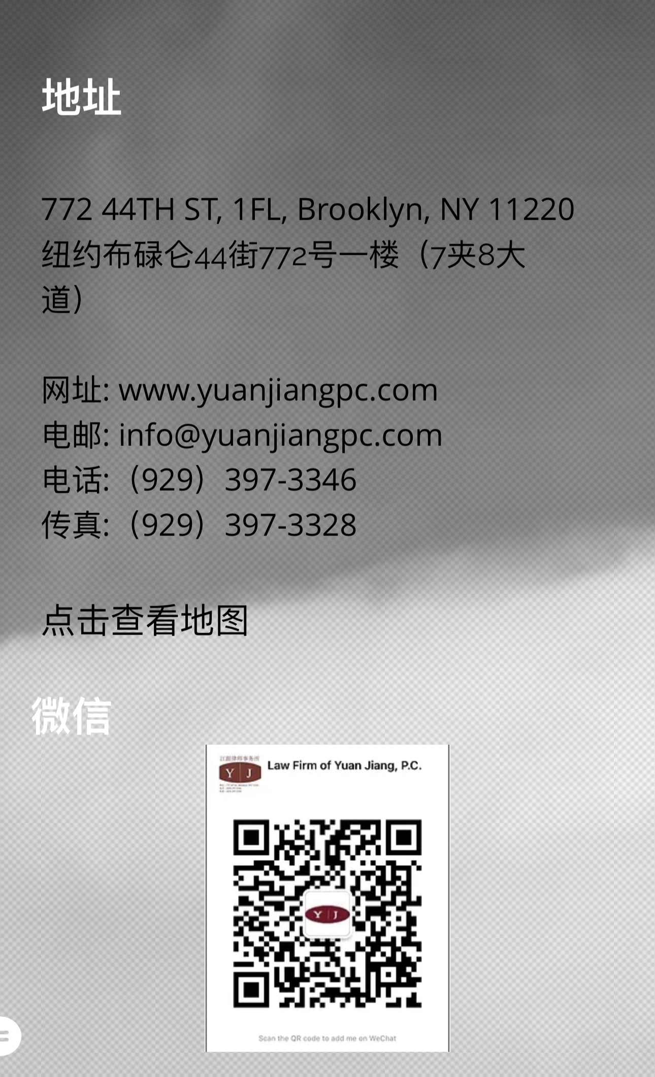 如有关以上所述方面的法律问题咨询请打:(929) 397-3346或亲临布碌仑44街772号一楼(7夹8大道)(772 44th Street, First Floor, Brooklyn, NY 11220)查询。