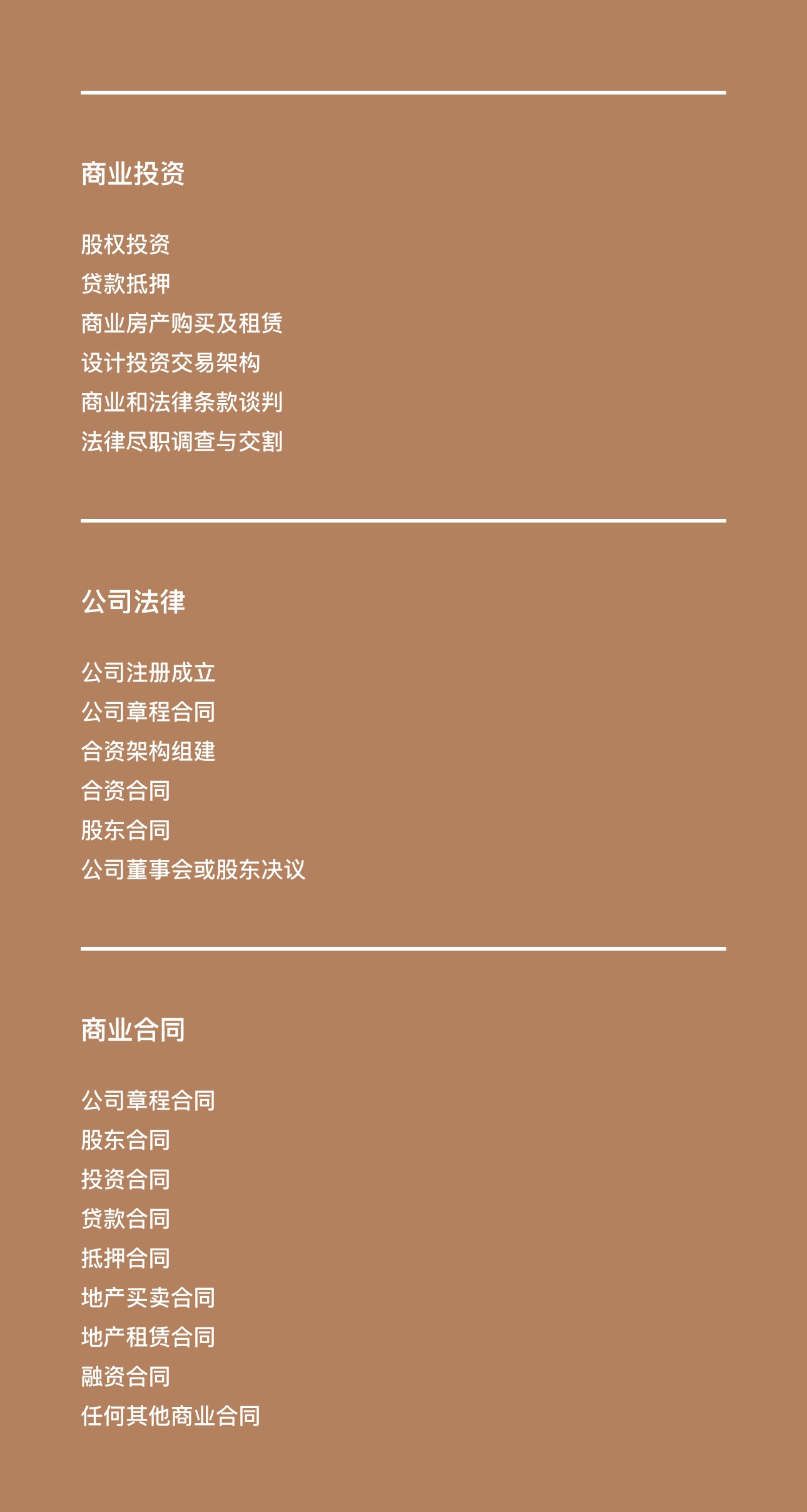自2016年起,徐律师在纽约和加州独立执业,擅长以下商业律师业务: