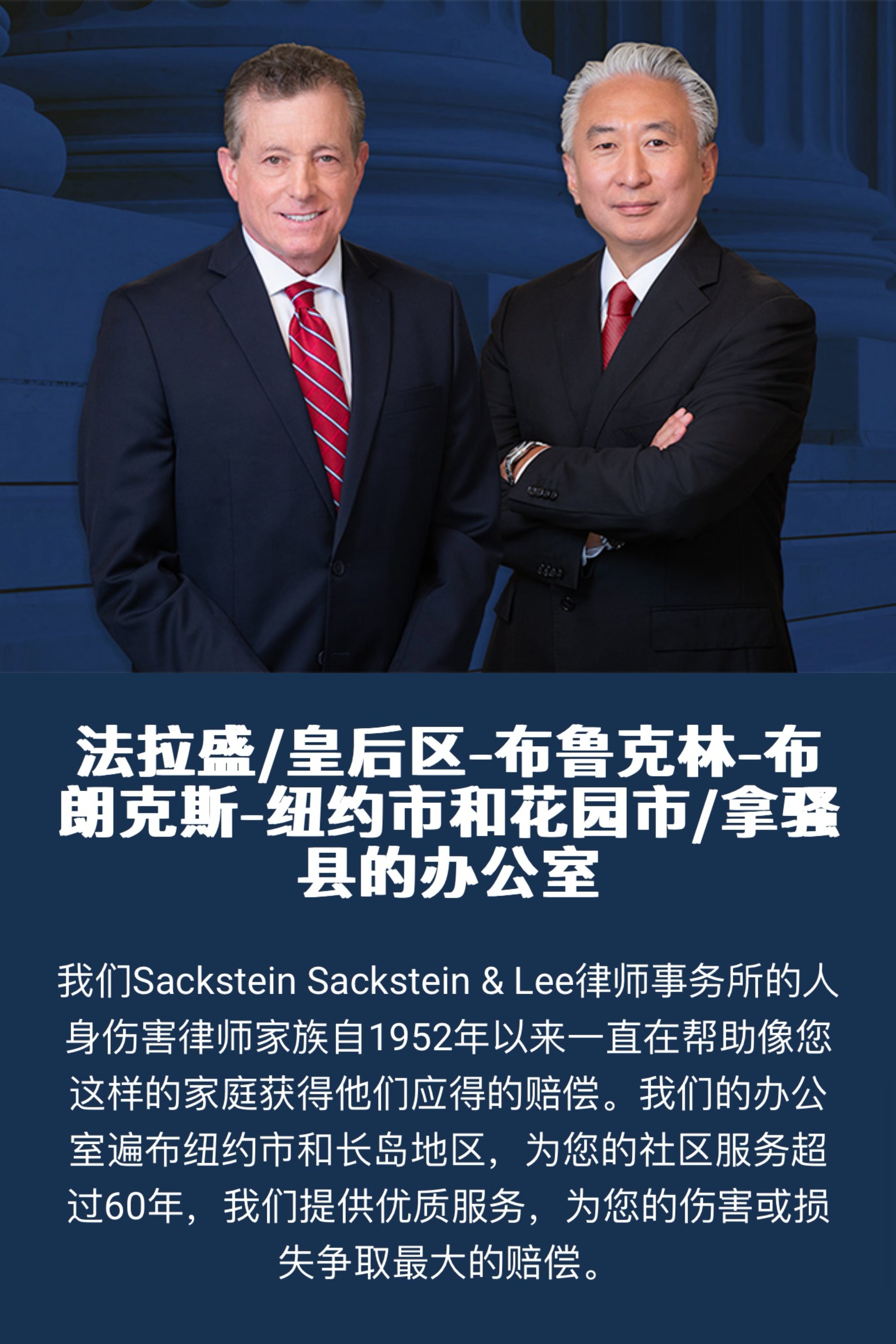 纽约就业劳动律师Sackstein Sackstein & Lee律师事务所的办公室遍布纽约市和长岛 为纽约皇后区服务的工人赔偿律师为皇后区、布鲁克林区、布朗克斯区、萨福克县和拿骚县的客户提供服务纽约工作相关事故