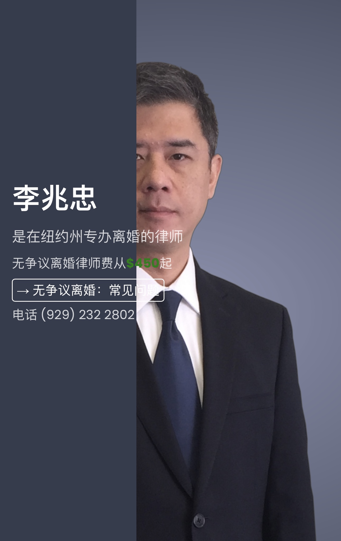 布鲁克林李兆忠离婚律师 李兆忠是在纽约州专办离婚的律师 无争议离婚律师费从$450起我专注于离婚法和相关事宜,如法律分居,婚前协议,子女监护权,子女探视,子女抚养费和家庭法庭案件。