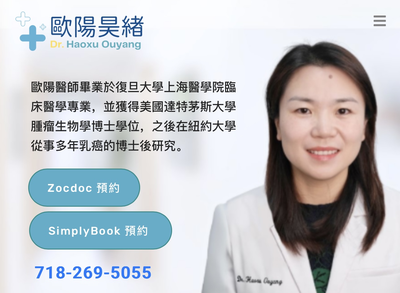 欧阳医生纽约家庭医生 欧阳华人家庭医生推荐 纽约欧阳家庭医生推荐 欧阳家庭医生诊所纽约家庭医生全方位医疗服务在纽约市的繁忙节奏中,找到一位可信赖的家庭医生是每个家庭维持健康的关键。欧阳昊绪医师精通医院管理医学、一般内科及初级保健,并具备美国内科医学委员会的认证及纽约州的医疗执照。身为家庭医生,欧阳医师为病患提供包括妇科常规检查在内的全面医疗服务,特别是针对女性健康问题,她都能提供专业的诊断与关怀。此外,欧阳医师也具备进行移民体检资质,协助计画在美国定居的移民完成必需的健康检查,精通英语和普通话。欧阳昊绪医生的综合内科专长上海复旦大学医学院医学博士美国达特茅斯大学癌症生物学博士金斯布鲁克犹太医疗中心内科住院医师培训3年纽约西奈山医疗系统的主治医生兼临床助理教授欧阳昊绪医师擅诊治各种内科疾病,包括高血压、糖尿病、高胆固醇、心脏病、过敏、气喘、肺病、贫血、头晕、胃痛、肝胆肾病变、甲状腺疾病、关节炎、泌尿道感染,性病等;提供全身检查,以及专项检查,如妇科检查、癌症筛检、大小便检查、抽血、心电图等医疗服务,且提供疫苗接种服务。一直以来我都希望用自己的专业知识帮助大家,不仅是在急性病发作的时候,更是在慢性病的预防和管理上。我希望用实证医学的方法帮助大家维护管理自己的健康,及时监测并早期检测,达到预防任何急诊和重症的目的。地址: 132-27 41st Road Unit 2C Flushing, NY 11355电话:718-269-5055传真:516-706-3880营业时间:周一至周六 9:00am – 5:00pm周天 休息
