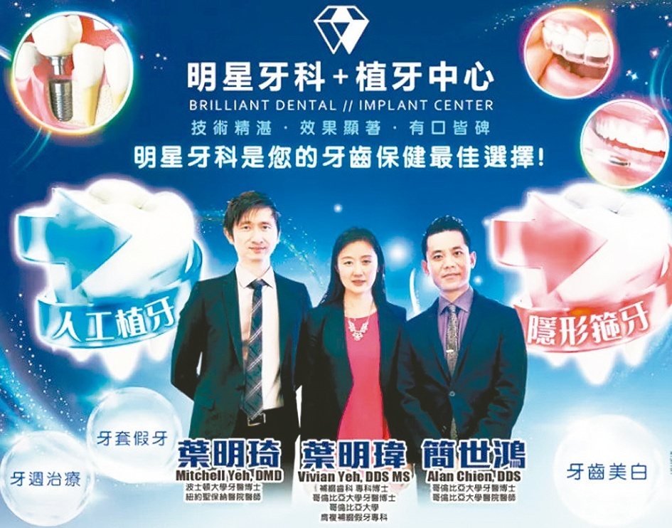 布碌仑区八大道拥有三层医务所的明星牙科近二十年,广受社区爱戴和好评。该牙科由著名国际口腔植牙专科医学院院士:叶明琦牙医博士(Mitchell Yeh, DMD)、国际口腔植牙专科医学院院士简世鸿博士(Alan Chien, DDS)及哥大赝复补缀假牙专科牙医叶明玮博士(Vivian Yeh, DDS MS) 共同主持,提供专业先进的植牙等全方位的牙科诊疗服务,采用最先进的仪器,其专业细心的高品质服务态度,专精矫牙、隐形矫牙服务、漂白牙齿, 更精于手术拔智慧齿、专长无痛治疗、特效一小时牙齿急速漂白、急诊止痛、发炎敏感、牙套、各类活动假牙、补牙洗牙、牙周手术、美容牙科、根管治疗、抽牙神经、儿童牙病、各类牙患等。