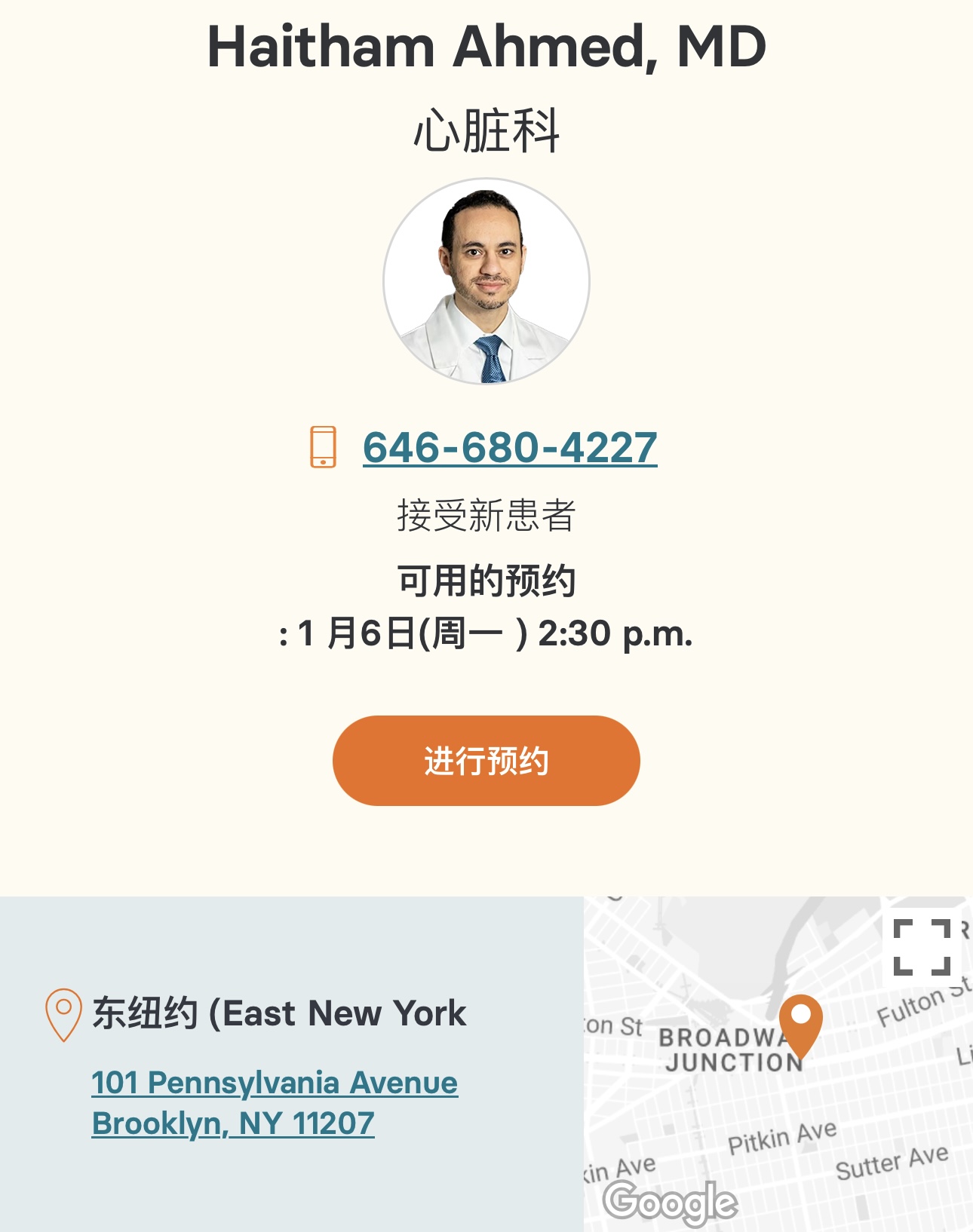 心脏专科医生推荐 心脏专科医生法拉盛 纽约最好的心脏专科医生Ahmed 医生是我们东纽约 (East New York) 诊所的一名心脏病专家。他在达特茅斯学院接受教育,并在约翰霍普金斯大学完成了实习、住院医生实习和专科医师培训。他隶属于勒诺克斯山医院。语言:阿拉伯语英文 住院医师:约翰霍普金斯大学