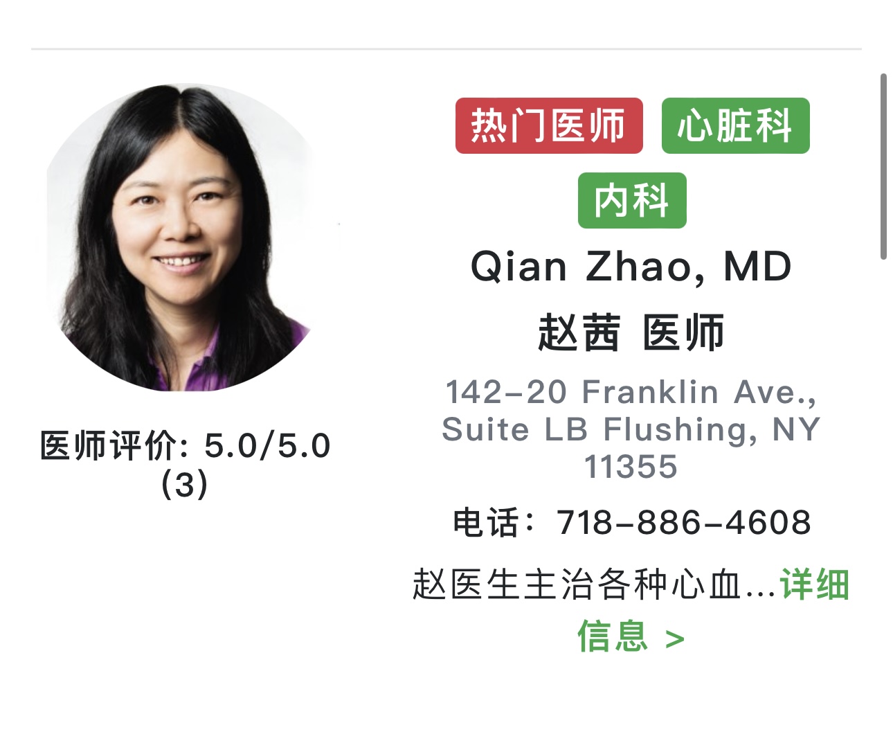 身处大都会的纽约,人群基数大,不同族裔,不同文化背景,尤其是各种各样的繁杂疑难病例对于医生的成熟至关重要。赵医师拥有美国心脏专科特考文凭(Board certified in Cardiovascular disease),核子心脏专科特考文凭(Board Certified in Nuclear Cardiology),心脏超声特考文凭(Board Certified in Adult Comprehensive Echocardiography),血管超声特考文凭(Registered Physician in Vascular Interpretation),心血管CT扫描特考文凭(Board Certified in Cardiovascular Computed Tomography)和内科专科特考文凭 (Board Certified in Internal Medicine)。为服务华人社区,赵蒨医生法拉盛诊所142-20 Franklin Ave, Suite LB隆重开张,主治各种心血管疾病,包括心脏冠状动脉粥样硬化,心脏衰竭,心律失常(房颤,房扑,心动过速,心动过缓和心动不齐),心脏瓣膜疾病,心肌炎,外周血管疾病,颈动脉粥样硬化,高血压,高血脂以及尤为重要心脏疾病的预防和保健。备有心电图,24小时心脏监测,运动平板心脏应激试验,心脏彩色Doppler超声和颈动脉超声,如需要其他监测,操作和手术,赵医师可以帮您联系到全美一流的心脏中心圣法兰西医院的有经验的医师为服务。