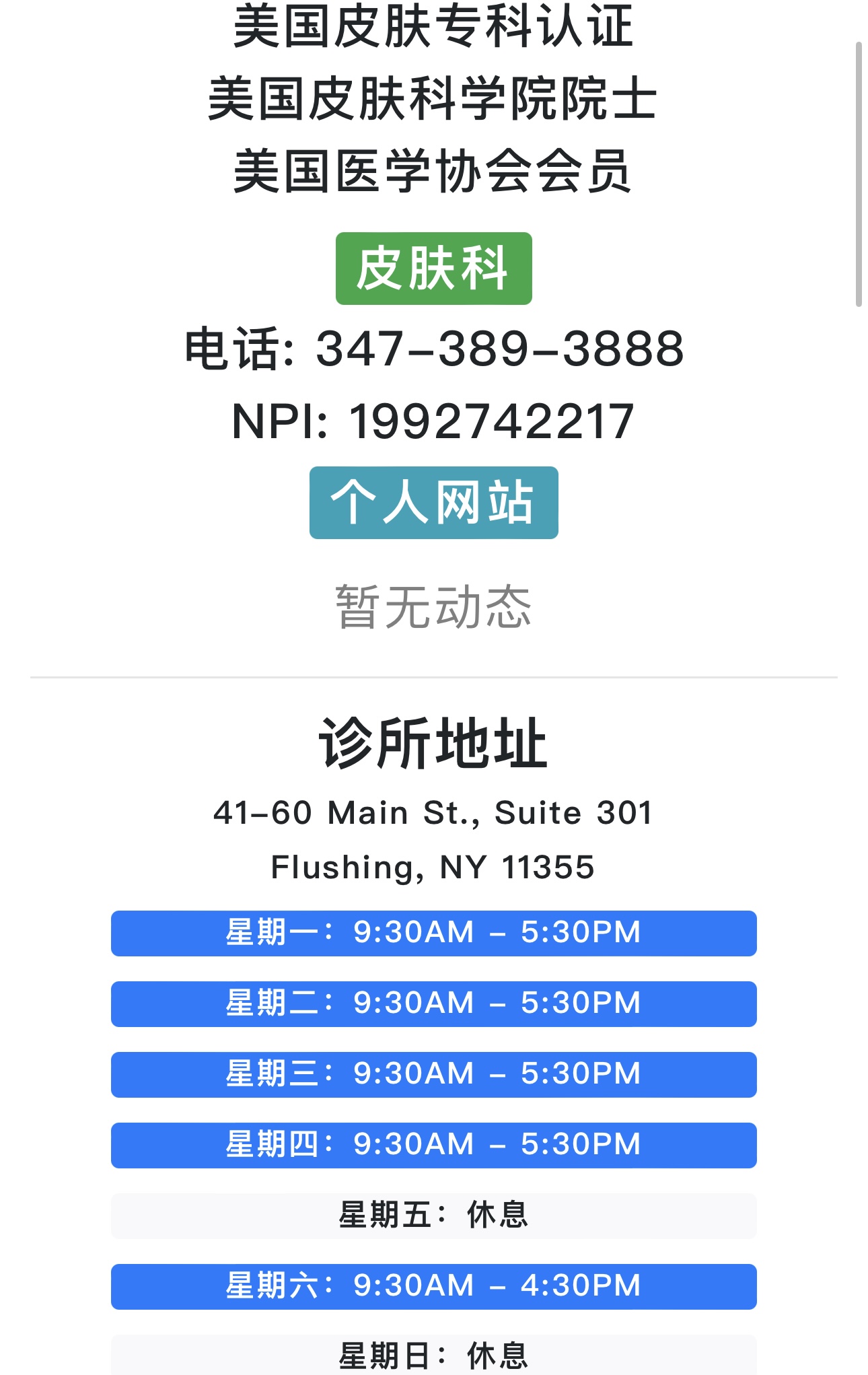 李实纽约皮肤科诊所 李实法拉盛皮肤科医生推荐 纽约李实最好的皮肤科医生推荐 李实皮肤科医生唐人街 八大道皮肤科李实拥有十多年临床经验李实医学博士主治成人及儿童各种皮肤疾病丶皮肤手术丶皮肤美容及镭射手术等。全新的医疗美容设备,接受大部分医疗保险,自费者优待,欢迎致电或亲临洽询有关皮肤及美容的问题。李医生毕业于美国着名的贝勒医学院,拥有细胞分子生物学和医学双博士学位,是美国资深皮肤科专科认证医生和美国皮肤科学院院士,目前在纽约大学皮肤科担任助理教授。以多年的经验和对面部整体结构衰老及美容研究,提供利用肉毒杆菌(Botox)和填补注射玻尿酸(Restylane, Juvederm)丶微晶瓷(Raddiess)等微整型服务。