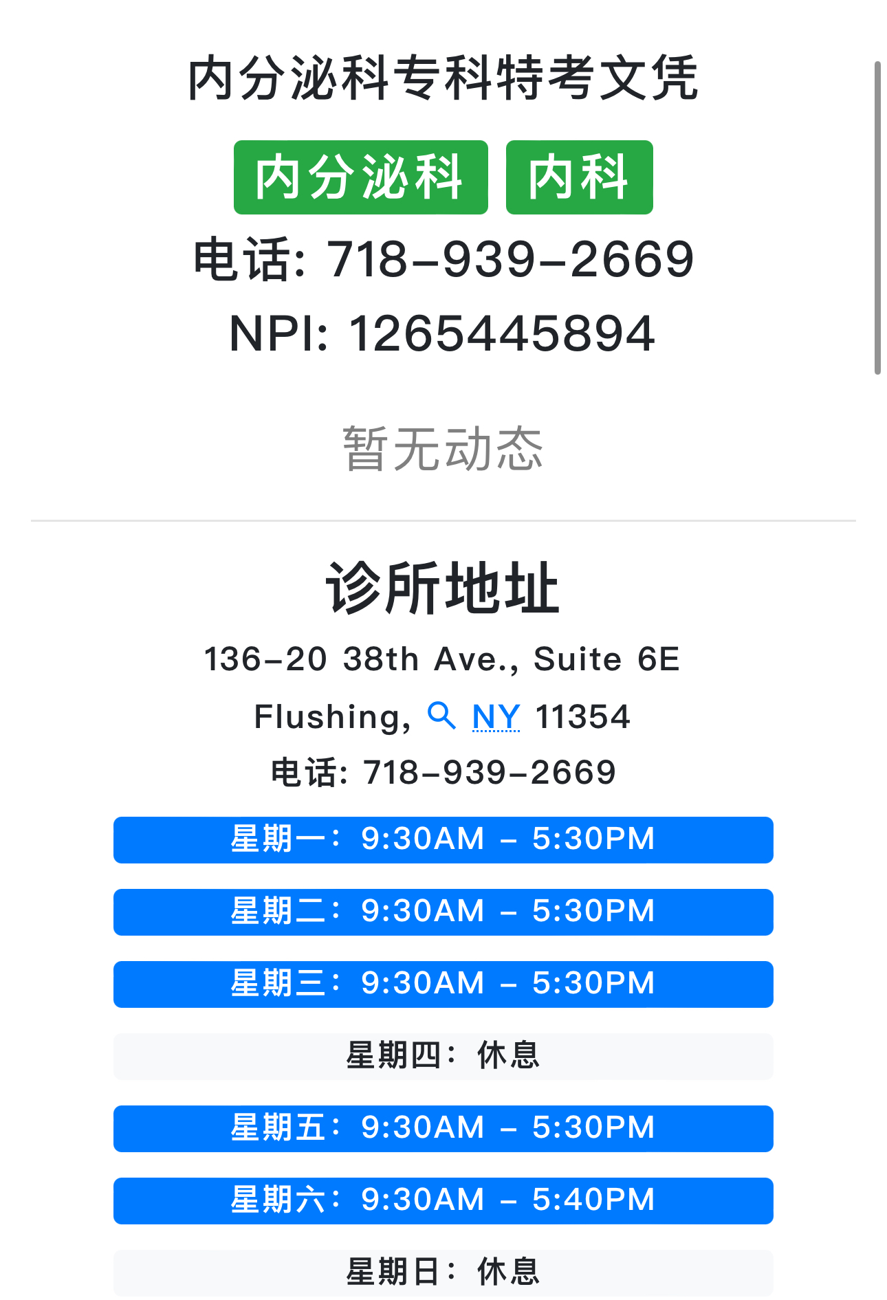 开诊时间:周一丶二丶三丶五丶六:9:30am-5:30pm,周四请来电预约,周日休息(精通国丶粤语及英语)718-939-2669