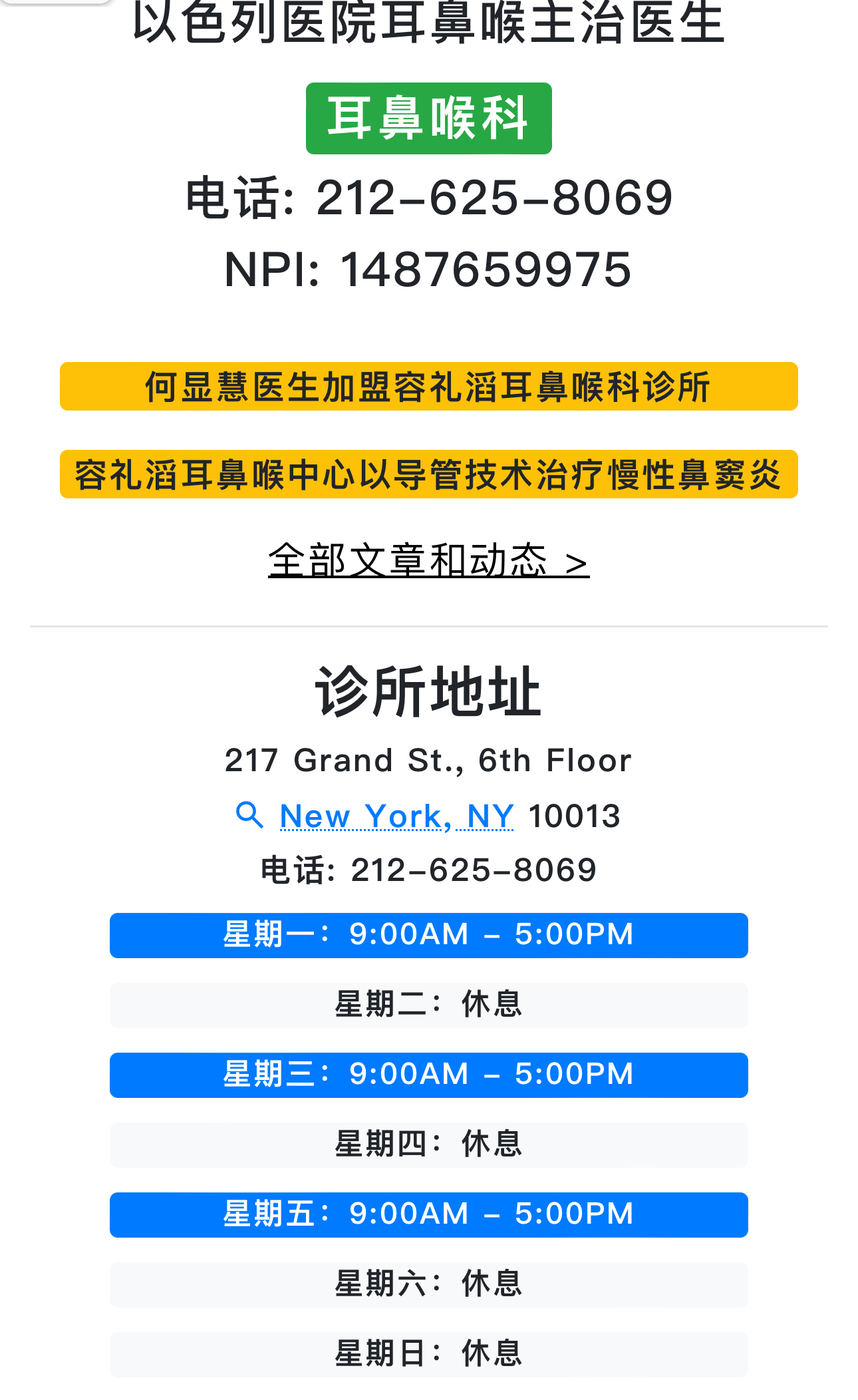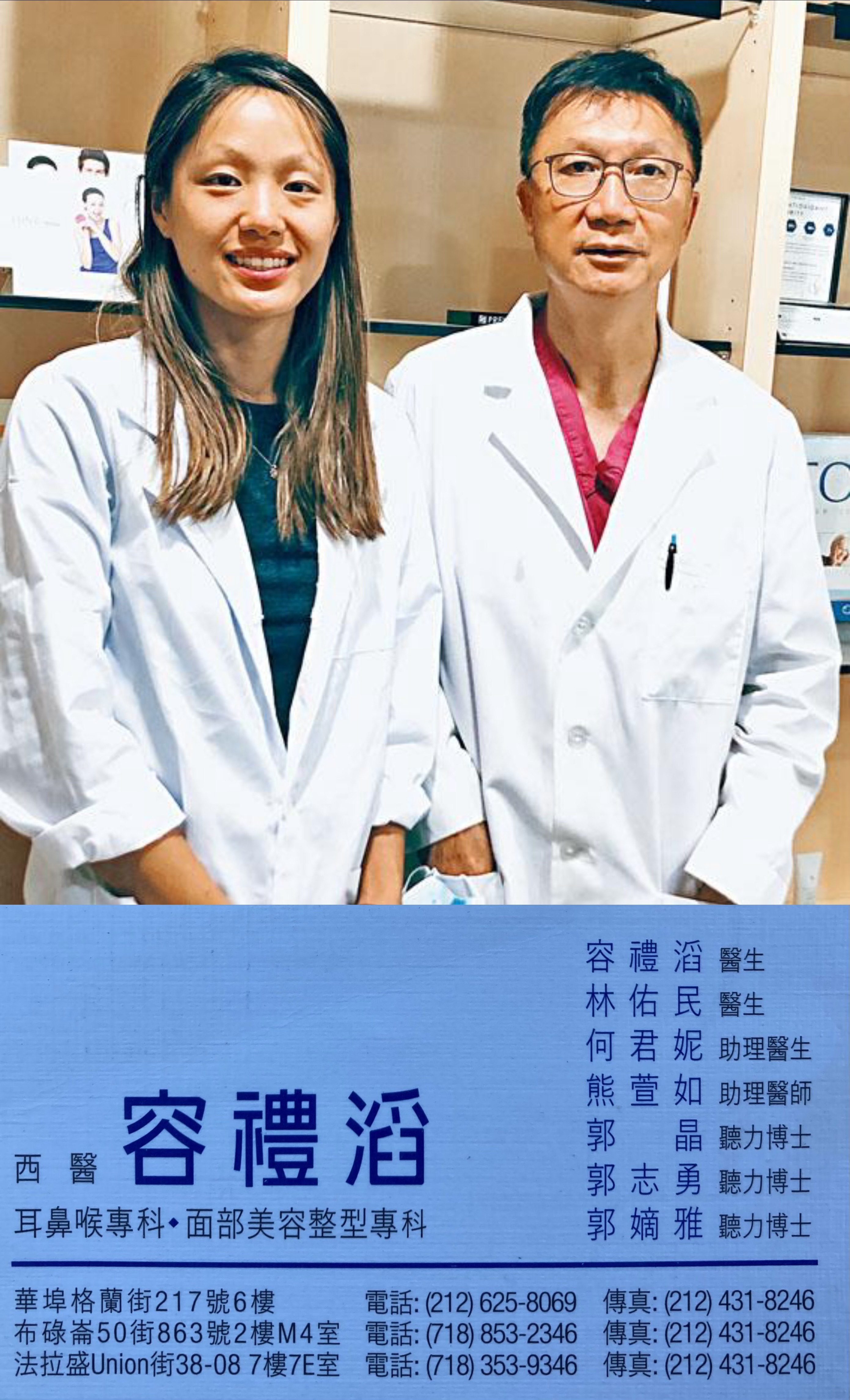 容禮滔纽约耳鼻喉科医生推荐 容禮滔法拉盛耳鼻喉科 纽约容禮滔耳鼻喉科医生唐人街容禮滔 醫生(右)與新加盟的何顯慧醫生(左)為病患帶來優質看診服務。服務曼哈坦華埠地區十餘年的「容禮滔耳鼻喉科及面部美容整型專科」(Raymond L. Yung M.D., F.A.C.S.),近日特聘新生力軍何顯慧醫生(Sandra Ho M.D)加盟 。該診所在華埠、法拉盛與布碌崙地區都有診所,能夠為病患提供最全面、即時和專業的醫療服務。容禮滔醫生畢業於麻州達芙斯TUFTS醫學院,具有醫學博士資格,美國耳鼻喉、頭頸專科特考文憑,美國耳鼻喉、頭頸專科學院院士,並曾為西奈山以色列猶太醫院和曼哈坦紐約大學醫學中心耳鼻喉主治醫生。容禮滔醫生診所駐有聽力博士及醫務人員,為兒童及成人提供高素質的耳鼻喉專科服務。診所內還提供鼻腔鏡、鼻咽、喉內視鏡及各種手術。各項聽覺及眩暈檢查都由註冊聽力博士主理,更特設助聽器及相關服務。容醫生華埠診所內佔地五千餘呎,有專業認可的CT掃描(電腦斷層掃描室),七個看診室,一個手術室。許多手術都可在診所內完成。近年來許多希望獲得容醫生優良診斷的病患紛紛而來,有見及此,容禮滔醫生特聘何顯慧醫生加入醫療團隊服務病患。何醫生在美國出生,在香港成長,其後返回美國受教育,是波地磨約翰霍普金斯大學及費城杰斐遜醫學院的醫學博士,在布碌崙紐約州立大學醫療中心出任住院醫生,是美國耳鼻喉頭頸專科學院院士,精通國、粵、英語。容禮滔 醫生有關耳鼻喉、頭、頸 科的 治療診斷服務特別多元化:包括電腦斷層掃描,在診所進行多角度的數碼電腦掃描,能快速診斷鼻竇炎、中耳炎等多種疾病;還增設導管通鼻,能快速打通鼻竇炎所引起的鼻塞情況。該診所更提供有對花粉、食物過敏問題的測試,以及脫敏注射治療。而診所的美容科服務,則提供各項專業臉部整型手術及醫學美容療程。此外,並備有先進的激光及其他新科技儀器、產品。為病人解決有關臉部整型、美容問題。診所人員精通國粵語、台山話、福州話,接受各種主要醫療保險。華埠:格蘭217號6樓(212-625-8069);布碌崙:50街863號M4室(718-853-2346);法拉盛診所:緬街41-60號3樓310A室(718-353-9346),敬請預約。容礼滔医生(Yung, Raymond)是纽约耳鼻喉(Otolaryngology)华人医生, 现可接收新患者。容医生的诊所位于863 50th St, Ste M4, , Brooklyn, NY 11220,联系电话是718-853-2346。容礼滔医生和其诊所下属工作人员可直接为您提供中文医疗服务,容医生诊所也可通过电话或网络视频为美国大部分地区患者提供非紧急远程中文医疗服务,容医生可以将绝大部分治疗药物处方直接发送到美国境内您指定的药房,您可致电容礼滔医生诊所了解详细信息。如有特殊医疗需要,北美好医生也会尽可能为您和医生提供远程医疗技术支持,致力让您在美国各地都能享受优质中文医疗服务。