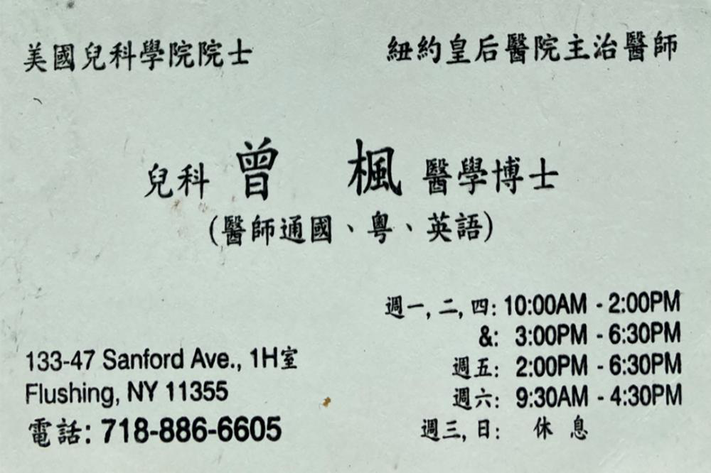 曾枫法拉盛儿科医生推荐 曾枫儿科医生法拉盛 纽约曾枫最好的儿科医生 美国儿科学院院士 美国儿科学院院士纽约皇后医院主治医师曾枫儿科医学博士(医师通国、专、英语)地址:133-47 Santord Ave., 1H室 Flushing, NY 11355电话: 718-886-6605周一,二,四:10:00AM2:00PM&: 3:00PM – 6:30PM周五:2:00PM-6:30PM周六:9:30AM-4:30PM周三、日 休 息