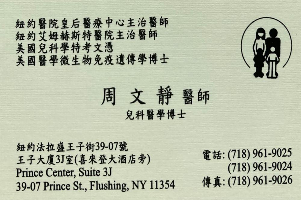 周文静法拉盛儿科医生推荐 周文静儿科医生法拉盛 纽约 周文静最好的儿科医生 纽约医院皇后医疗中心主治医师 纽约医院皇后医疗中心主治医师纽约艾姆赫斯特医院主治医师美国儿科学特考文凭美国医学微生物免疫遗传学博士周文静 医师儿科医学博士地址:纽约法拉盛王子街39-07号王子大厦3J室(喜来登大酒店旁)Prince Center, Suite 3J39-07 Prince St., Flushing, NY 11354电话: (718)961-9025(718) 961-9024传真: (718)961-9026