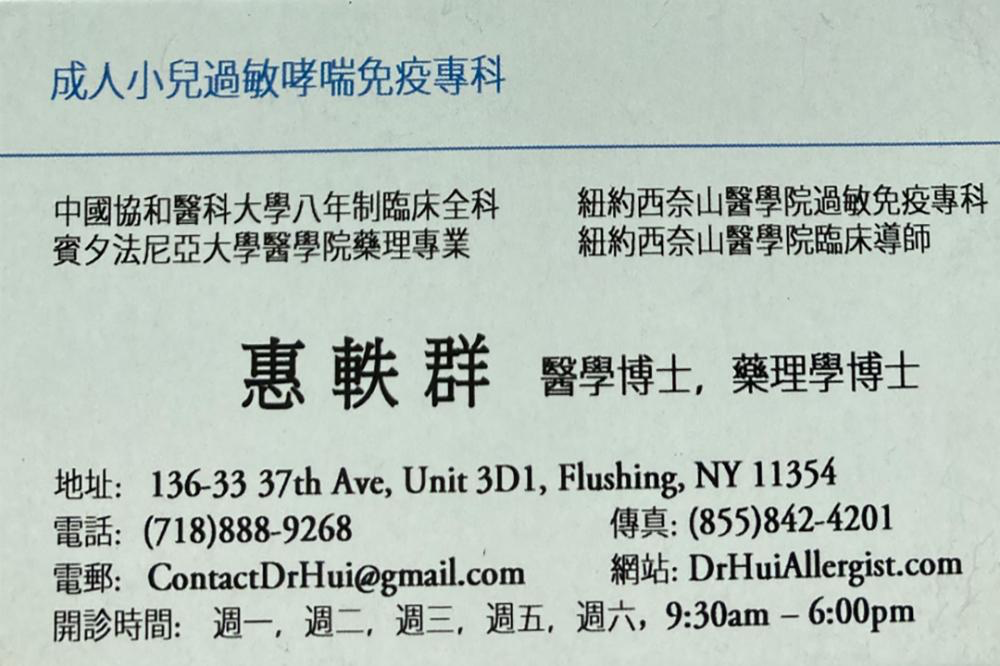 惠轶群法拉盛儿科医生推荐 惠轶群儿科医生法拉盛 纽约惠轶群最好的儿科医生成人小儿过敏哮喘免疫专科中国协和医科大学八年制临床全科纽约西奈山医学院过敏免疫专科宾夕法尼亚大学医学院药理专业纽约西奈山医学院临床导师惠轶群医学博士,药理学博士地址:136-33 37thAve,Unit3D1,Flushing,N11354电话:(718)888-9268传真:(855)842-4201电邮:ContactDrHui@gmail.com网站:DrHuiAllergist.com开诊时间:周一,周二周三,周五周六,9:30am-6:00pm