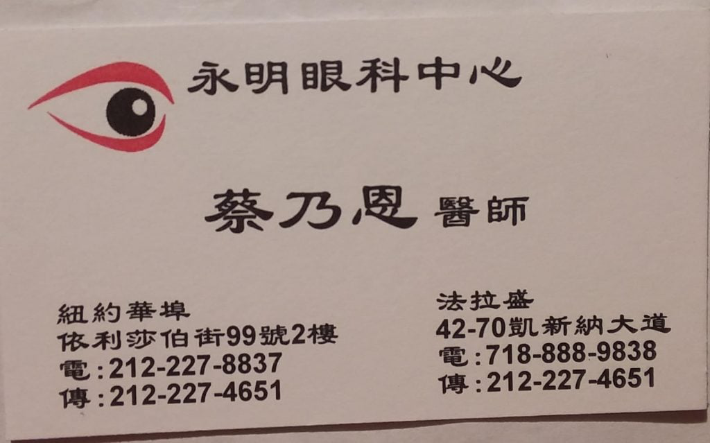 眼科医生法拉盛 纽约眼科医生推荐 八大道眼科医生 唐人街眼科医生推荐永明眼科中紐約華卑蔡乃恩 醫師依利莎伯街99號2樓電:212_227_8837傅:212_227-465142_70凱新納大道電:718-888-9838傅:212-227-4651