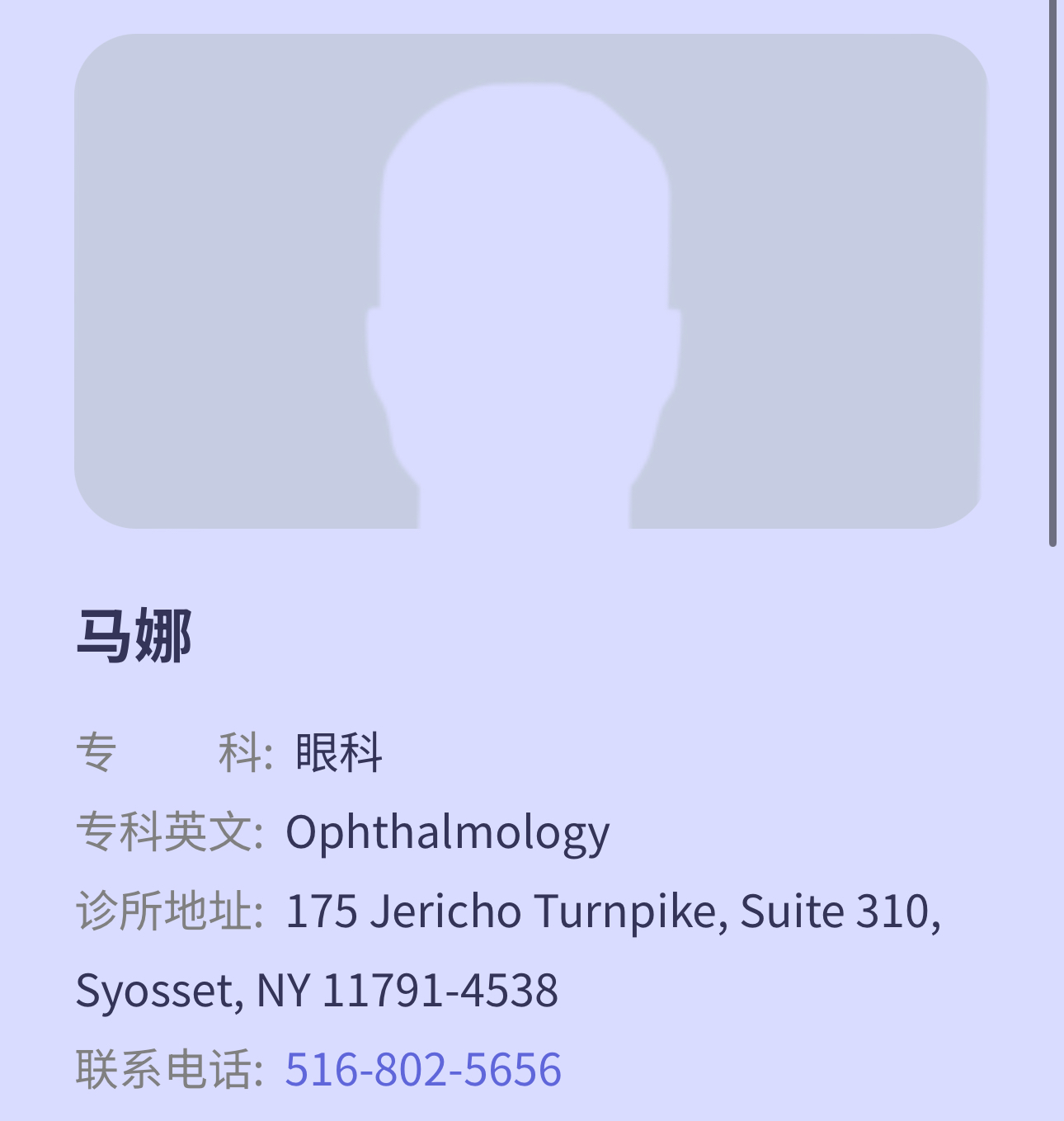 马娜眼科医生法拉盛 纽约马娜眼科医生推荐 马娜八大道眼科医生 唐人街眼科医生推荐 马娜医生(Ma, Na)是纽约眼科(Ophthalmology)华人医生, 现可接收新患者。马医生的诊所位于175 Jericho Turnpike, Suite 310, Syosset, NY 11791-4538,联系电话是516-802-5656。马娜医生和其诊所下属工作人员可直接为您提供中文医疗服务,马医生诊所也可通过电话或网络视频为美国大部分地区患者提供非紧急远程中文医疗服务,马医生可以将绝大部分治疗药物处方直接发送到美国境内您指定的药房,您可致电马娜医生诊所了解详细信息。