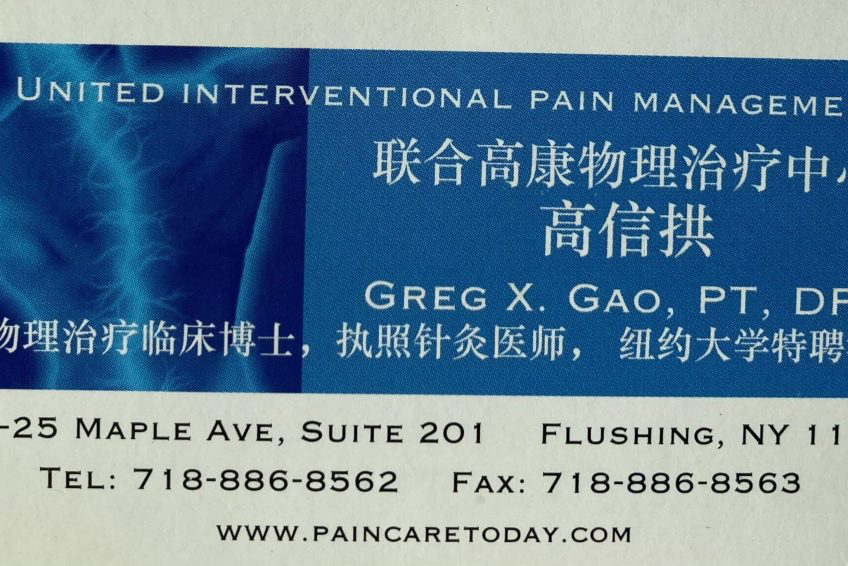 高信拱物理治疗法拉盛 高信拱物理治疗师推荐 纽约高信拱最好的物理治疗师 纽约联合高康物理治疗中心 高信拱 物理治疗临床博士 718-886-8562联合高康物理治疗中心United Interventional Pain Managment高信拱Greg X. Gao PT, DPT物理治疗临床博士,执照针灸医师,纽约大学特聘教授地址:136-25 Maple Ave. Suite 201 Flushing NY 11355电话:718-886-8562传真:718-886-8563网址:www.paincaretoday.com