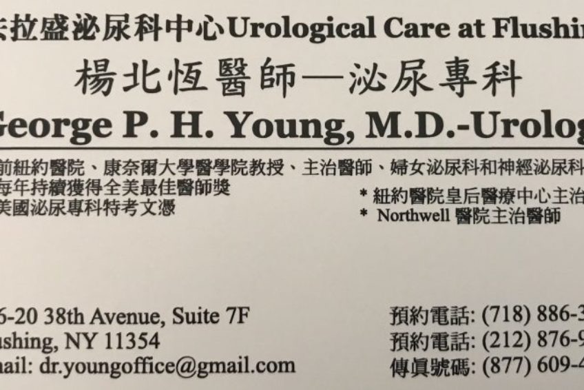杨北恒泌尿科医生法拉盛 杨北恒泌尿科医生推荐 纽约 杨北恒最好的泌尿科医生 杨北恒医师一泌尿专科电话: (718) 886-3522 / (212) 876-9802地址:136-20 38th Avenue, Sulte 7F Flushing, NY 11354专治:各种泌尿病症、妇女膀胱下垂、膀胱再造;泌尿系统癌症诊断与治疗,泌尿神经系之病症,男女尿失禁、排尿困难、尿出血、尿痛、尿频、小便无力;摄护腺肿大、摄护腺癌、睾丸疾病;小肠气、性病、 结扎、割包皮、肿瘤、各种结石。杨北恒医师, 前纽约医院、康乃尔大学医学院教授、主治医师, 持续获得全美最佳医师奖。