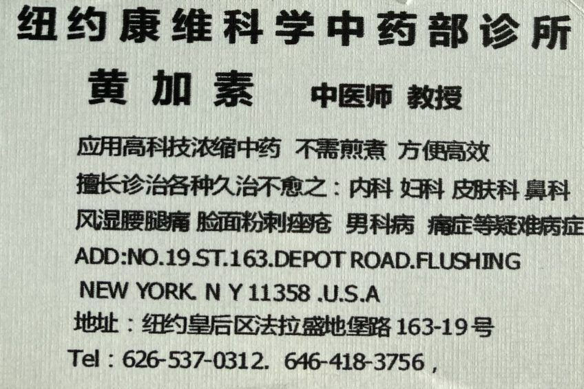 康维黄加素纽约中医推荐 法拉盛康维黄加素中医推荐 纽约康维黄加素针灸推荐 法拉盛有名中医纽约康维科学中药部诊所黄加素 中医师 教授应用高科技浓缩中药 不需煎药 方便高效擅长诊治各种久治不愈之:内科, 妇科, 皮肤科,鼻科,风湿腰腿痛 脸面粉刺痤疮, 男科病,痛症等疑难病症地址:纽约皇后区法拉盛地堡路163-19号No.19 St. 163 Depot Road Flushing New York NY 11358 USA电话:626-537-0312, 646-418-3756