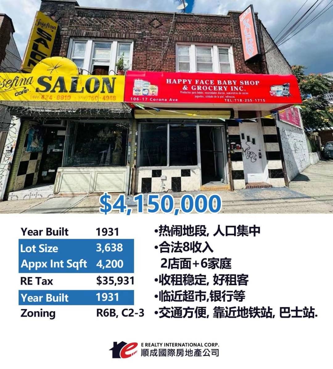 Corona纽约可乐娜房子出售Corona NY House For Sale新上市可乐娜房屋出售[Party]顺成独家代理🌟Corona商住楼出售🌟热闹地段,人口集中🌟合法8收入(2店面+6家庭)🌟收租稳定,好租客,临近超市,银行等🌟交通方便,靠近地铁站,巴士站.🔥售价$415萬🔥顺成国际房地产E Realty Int'l Corp 3473318440