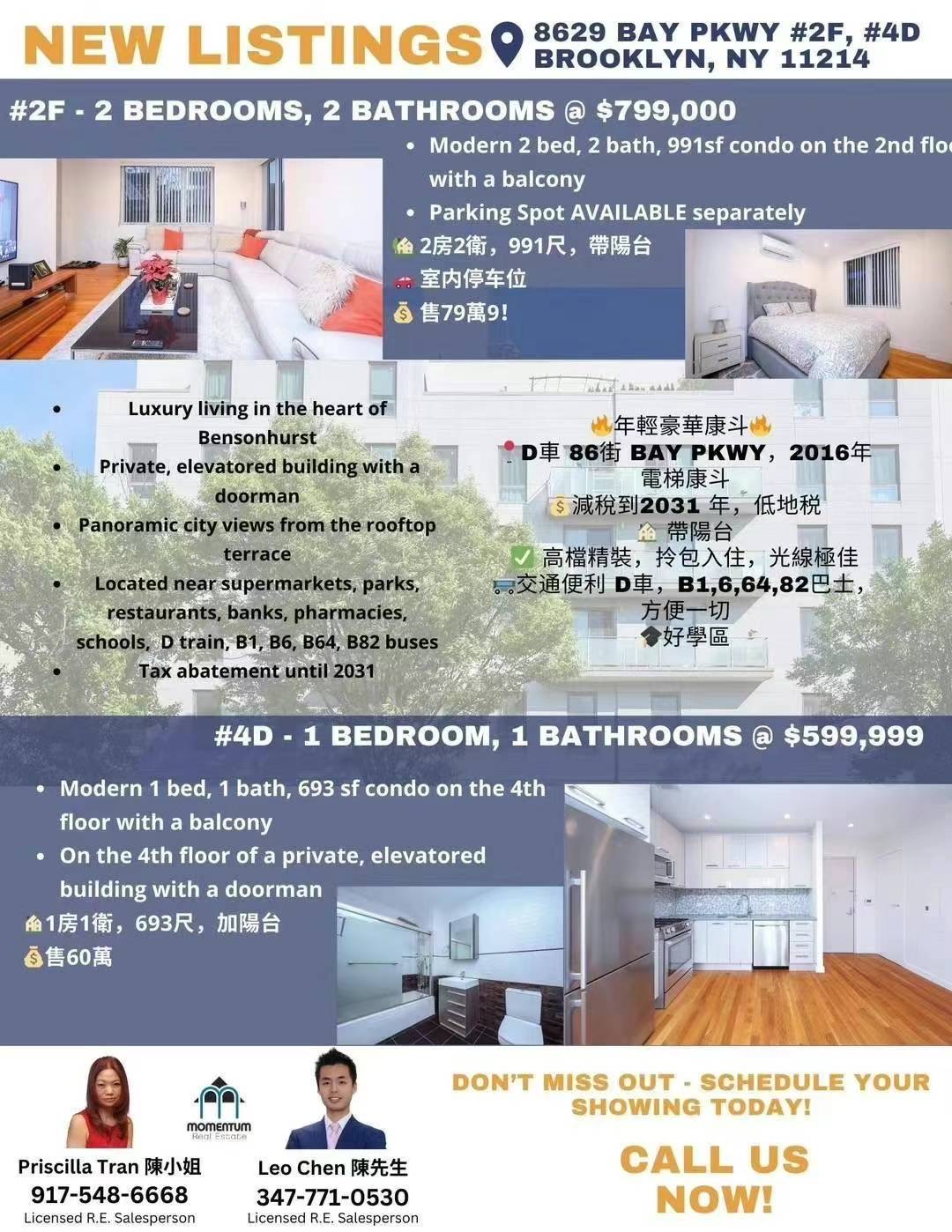 ASKING : $ 799,000🔥新上市🔥年輕豪華康斗📍86街 Bay Pkwy,8629 Bay Pkwy 2F💰減稅到2031 年,電梯康斗🏠2房2衛,991尺,帶陽台🏠高檔精裝,拎包入住,光線極佳